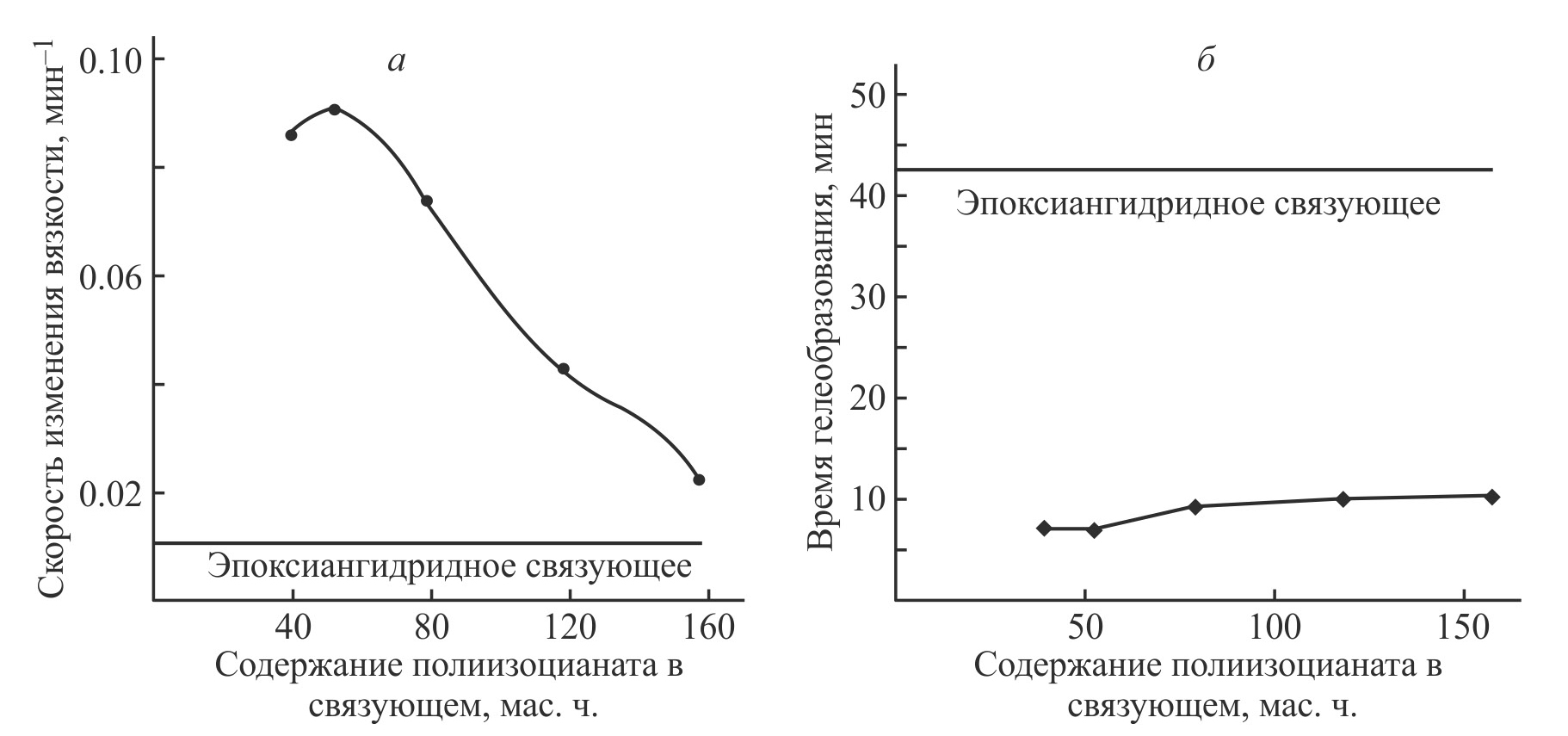 Скорость изменения вязкости исследуемых эпоксиизоцианатных связующих выше, чем эпоксиангидридного (рис. 4, а). В целом выявлен экстремальный характер зависимости изменения обозначенной характеристики от содержания полиизоцианата. Разница между значениями скоростей изменения вязкости для двух связующих с минимальным содержанием полиизоцианата составляет около 5.2%. Вероятно, это может быть обусловлено тем, что при прочих равных условиях и низком содержании полиизоцианата (52.5 мас.ч. на 100 мас.ч. эпоксидиановой смолы и ниже) формирование изоциануратов затруднено ввиду недостаточного количества изоцианатных групп, поскольку бóльшая часть их задействована при образовании связей с гидроксильными группами эпоксидной смолы [12]. Поскольку образование оксазолидоновых гетероциклов и простых эфирных связей происходит при более высоких температурах (150°С и выше) [13, 14], чем тримеризация изоцианата и образование уретановых связей, продукт взаимодействия полиизоцианата и эпоксидной смолы, по всей видимости, будет представлять собой смесь олигомеров с высокой молекулярной массой. Скорость изменения вязкости в результате реакции снижается с уменьшением содержания эпоксидной смолы, что в целом согласуется с литературными данными [15]. Возрастающая зависимость времени гелеобразования от содержания полиизоцианата (рис. 4, б) в целом подтверждает это. Время гелеобразования эпоксиизоцианатных связующих существенно ниже, чем у эпоксиангидридного (в 6.1–4.2 раза).