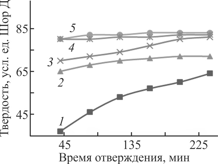 Содержание полиизоцианата (мас. ч.) на 100 мас. ч. эпоксидиановой смолы марки ЭД-20: 1 — 39.40, 2 — 52.50, 3 — 78.75, 4 — 118.13, 5 — 157.50.