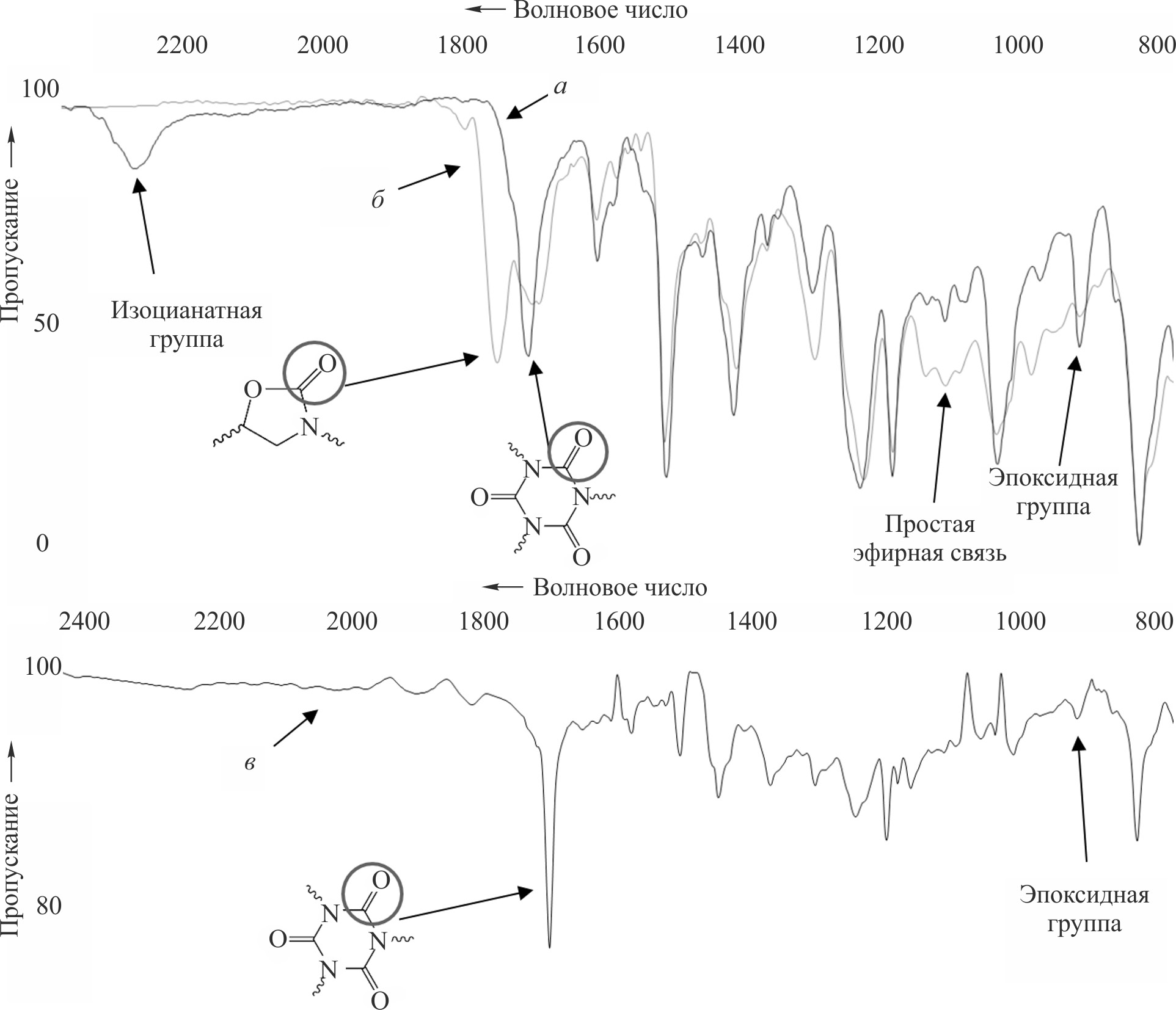 Это также подтверждается результатами ИК-спектроскопии (рис. 6, спектры а, б): после термостатирования фиксируются полосы поглощения оксазолидоновых фрагментов (1750 см–1), чего не наблюдалось в спектрах образцов до термостатирования. Кроме того, исчезает полоса поглощения изоцианатной группы (2270 см–1), снижаются интенсивности полос поглощения изоциануратных (1705 см–1) и эпоксидных циклов (915 см–1) и увеличивается интенсивность полосы поглощения, характерная для простой эфирной группы (1105 см–1).