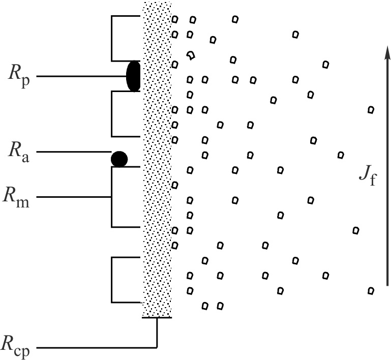 Rp — перекрывание пор, Ra — адсорбция, Rm — мембрана, Rcp — слой повышенной концентрации растворенных веществ.