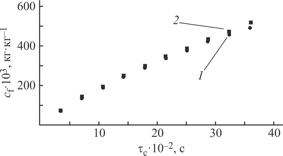 Анализ графиков на рис. 5 подтверждает адекватность предложенного решения, так как относительная погрешность экспериментальных и расчетных значений концентрации асфальто-смолистых примесей в процессе ультрафильтрации отработанных моторных масел через мембрану УФФК в исходном резервуаре составляет в среднем 3.6%.