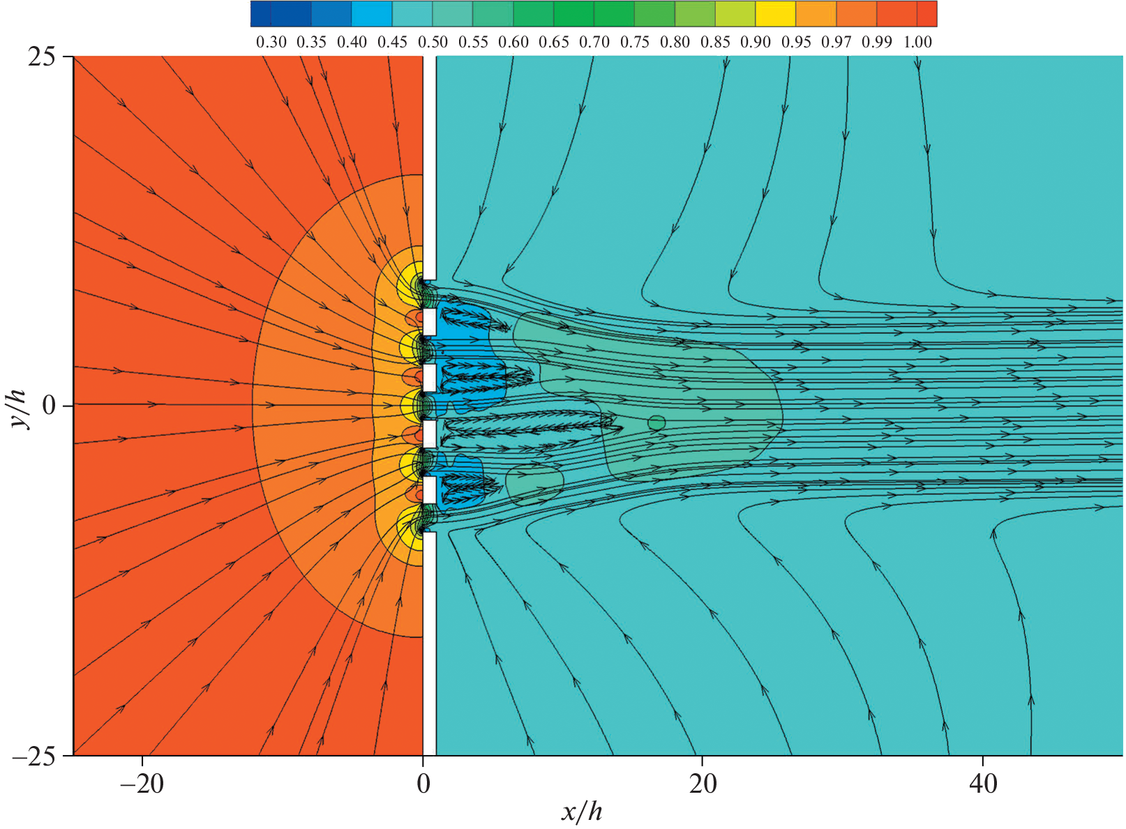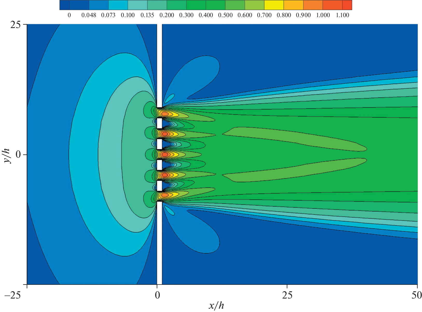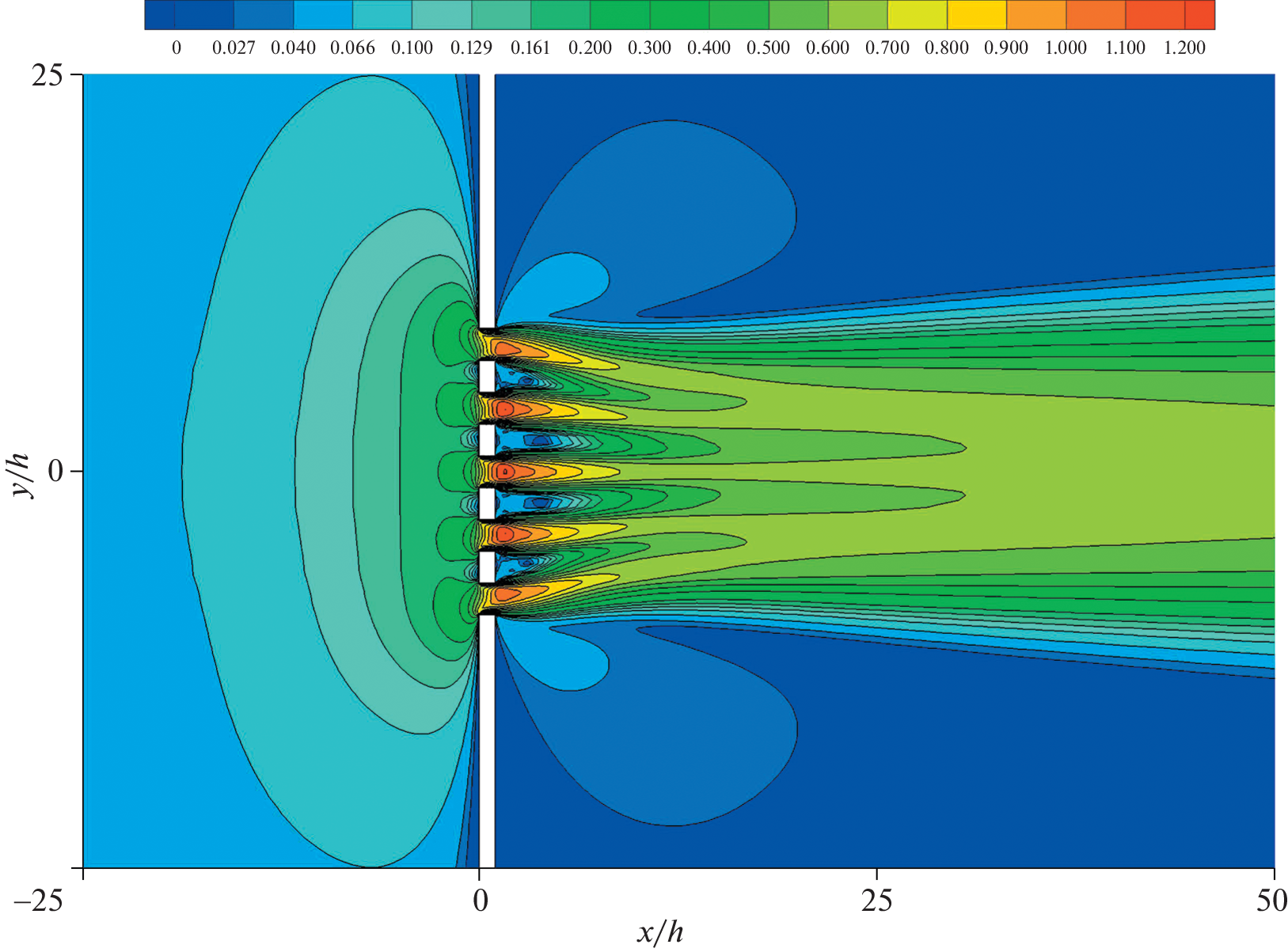 The S-model kinetic equation is used to study the rarefied gas flow from a high-pressure tank to a low-pressure one through a flat membrane with a finite number of pores. The kinetic equation is solved numerically using a second-order accurate implicit conservative method implemented in the in-house code Nesvetay. For transitional and continuum flow regimes, numerical solutions of the compressible Navier–Stokes equations are obtained. The gas flow rate through the system of pores and the forces acting on the membrane bars are investigated as functions of the Knudsen number (Kn) at a pressure ratio of 2 : 1 in the tanks. The features of the flow field near the membrane and away from it are described.