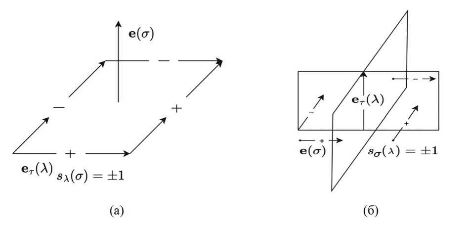 Здесь — удельная площадь грани s, знаковые функции и ( ) определены, как указано на фиг. 2. Определим граничную знаковую функцию , при условии что вращение в направлении от орта к его дополняющему (в базисе ) дает направление внешней нормали к области О. Если же вращение в направлении от орта к его дополняющему в этом поверхностном базисе дает направление внутренней нормали к этой области, то .