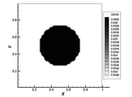 Фиг. 4. Распределение плотности на момент времени 0.05 мкс, z = 0.5.