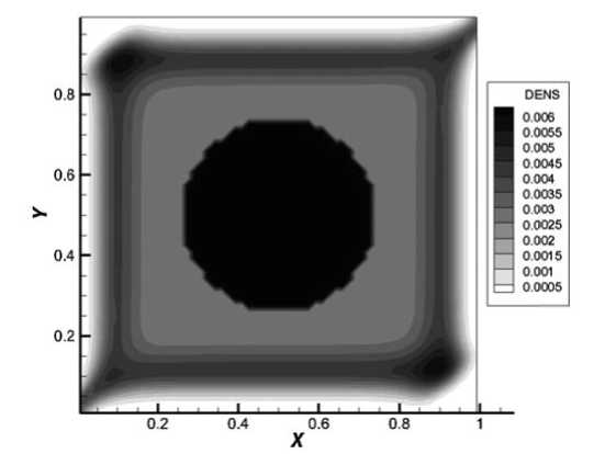 На фиг. 4–7 представлены результаты расчетов плотности и магнитных полей в момент времени 0.05 мкс. На фиг. 4 изображено распределение плотности, на котором можно увидеть, что под воздействием магнитных полей происходит сжатие плотности к центру расчетной области.