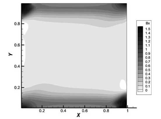 Фиг. 5. Распределение компоненты магнитной индукции Bx на момент времени 0.05 мкс, z = 0.5.
