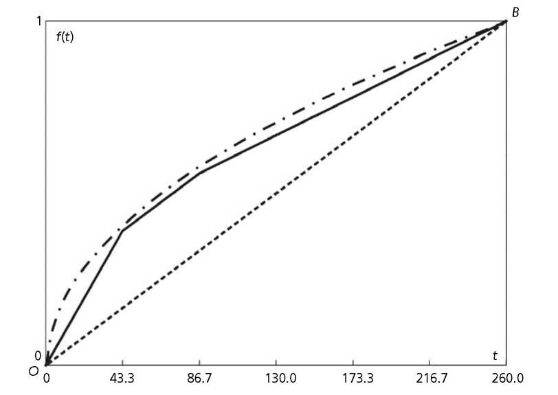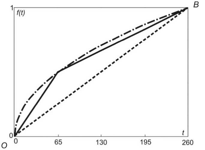 Численное решение задачи оптимизации траектории деформирования сводится к перебору вариантов при каждом параметре tk. Набор вариантов функции f(t) задается ломаными линиями, проходящими от точки O к точке B (фиг. 2). В результате оптимальное решение, полученное методом динамического программирования при N=3, M=9, N=4, M=12 и N=6, M=18 (фиг. 2–4), приближается к аналитической кривой и не совпадает с линейной функцией (жирная кривая — численные результаты, штрихпунктирная кривая — аналитические данные для больших прогибов пластины, см. [6; 12]). Вычисленное максимальное значение работы рассеяния в пластинке по аналитической траектории в случае больших прогибов оказывается меньшим по сравнению со всеми возможными траекториями, определенными методом динамического программирования.