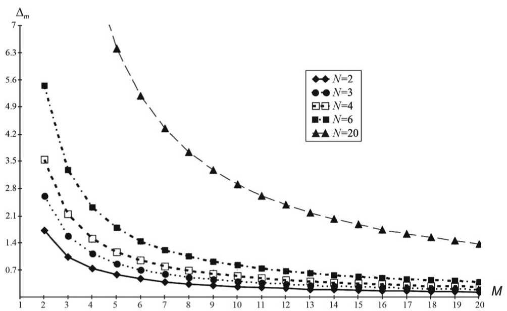 Фиг. 5. Изменение Dm в зависимости от N, M по формуле (3.7).