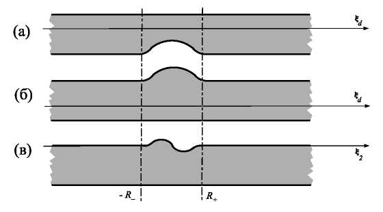 Фиг. 2. Цилиндры с утончением (a) и утолщением (б). Возмущение полосы при сохранении площади резонатора, отсеченного штрихпунктирными линиями (в).