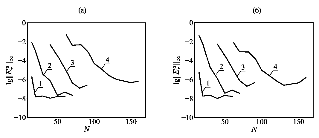 На фиг. 1а величина N для (4) и (5) обозначает число узлов, а для кубических сплайнов — количество подынтервалов разбиения. Видно, что для получения абсолютной погрешности порядка 10–15 для дробно-рациональных приближений требуется около 60 узлов, а для алгебраических полиномов — 170. Зависимость логарифма погрешности интерполяции кубическими сплайнами от N является выпуклой вниз функцией, что говорит о сходимости с конечным порядком. Действительно, порядок сходимости здесь равен четырем независимо от N. В этом случае для получения точности порядка 10–15 потребуется уже около 16 500 подынтервалов.