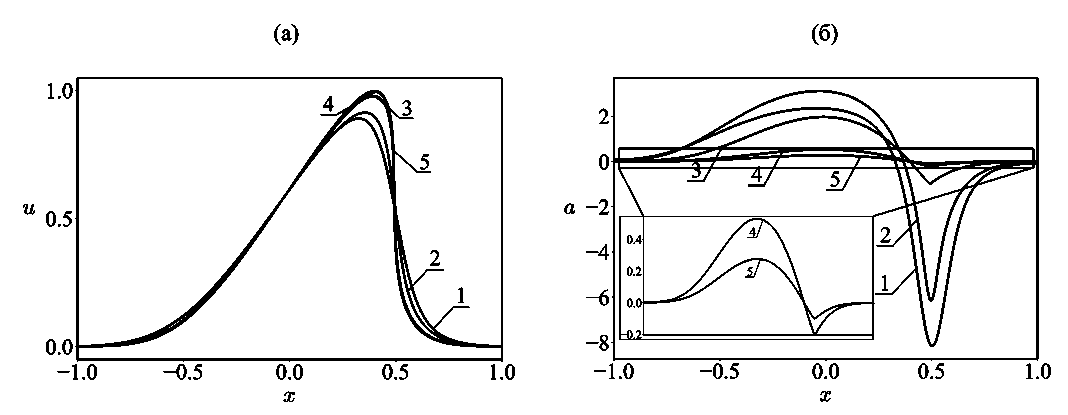 Фиг. 7. Профили u(0.4,x) (а) и a(0.4,x) (б) при W = 0.5, Re = 100 и различных b, равных 0 (1), 0.14 (2), 0.42 (3), 0.7 (4), 1.26 (5).