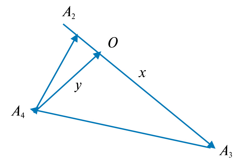 В (32) через обозначены радиус-векторы соответствующих точек в некоторой системе координат. Если мы задаем расстояния от четвертой точки до второй и третьей, то из (32) становится ясно, что четвертая точка может находиться только в двух положениях на плоскости, определяемых соотношениями (32) (по обе стороны от отрезка ). Таким образом, расположение точки относительно не может быть произвольным и не обязательно должно быть справедливо равенство