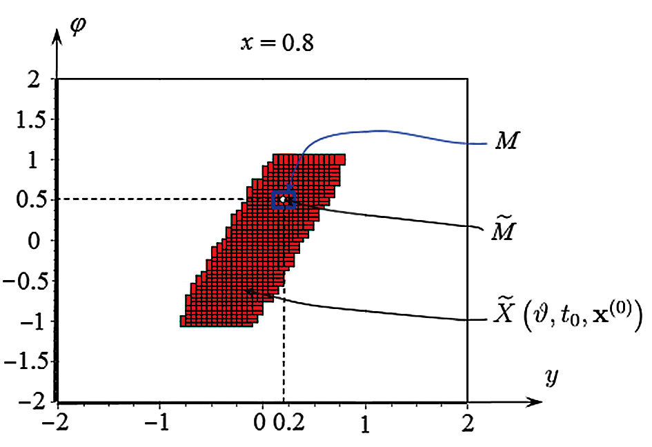 Фиг. 1. Сечения множеств M MathType@MTEF@5@5@+= feaahGart1ev3aaatCvAUfeBSjuyZL2yd9gzLbvyNv2Caerbov2D09 MBdbqeduuDJXwAKbYu51MyVXgarqqr1ngBPrgifHhDYfgasaacH8Wr Fv0xbbf9q8WrFfeuY=Hhbbf9v8qqaqFr0xc9pk0xbba9q8WqFL0dir =xcvk9FHe9v8qqaq=dir=f0=yqaqVeLsFr0=vr0=vr0db8meaabaqa ciaacaGaaeqabaqabeGadaaakeaacaWGnbaaaa@3671@ , M ˜ MathType@MTEF@5@5@+= feaahGart1ev3aaatCvAUfeBSjuyZL2yd9gzLbvyNv2Caerbov2D09 MBdbqeduuDJXwAKbYu51MyVXgarqqr1ngBPrgifHhDYfgasaacH8Wr Fv0xbbf9q8WrFfeuY=Hhbbf9v8qqaqFr0xc9pk0xbba9q8WqFL0dir =xcvk9FHe9v8qqaq=dir=f0=yqaqVeLsFr0=vr0=vr0db8meaabaqa ciaacaGaaeqabaqabeGadaaakeaadaaiaaqaaiaad2eaaiaawoWaaa aa@3733@  и X ˜ (ϑ, t 0 , x (0) ) MathType@MTEF@5@5@+= feaahGart1ev3aaatCvAUfeBSjuyZL2yd9gzLbvyNv2Caerbov2D09 MBdbqeduuDJXwAKbYu51MyVXgarqqr1ngBPrgifHhDYfgasaacH8Wr Fv0xbbf9q8WrFfeuY=Hhbbf9v8qqaqFr0xc9pk0xbba9q8WqFL0dir =xcvk9FHe9v8qqaq=dir=f0=yqaqVeLsFr0=vr0=vr0db8meaabaqa ciaacaGaaeqabaqabeGadaaakeaadaaiaaqaaiaadIfaaiaawoWaai aaiIcacqaHrpGscaaISaGaamiDamaaBaaaleaacaaIWaaabeaakiaa iYcacaWH4bWaaWbaaSqabeaacaaIOaGaaGimaiaaiMcaaaGccaaIPa aaaa@40F7@  плоскостью x=0.8 MathType@MTEF@5@5@+= feaahGart1ev3aaatCvAUfeBSjuyZL2yd9gzLbvyNv2Caerbov2D09 MBdbqeduuDJXwAKbYu51MyVXgarqqr1ngBPrgifHhDYfgasaacH8Wr Fv0xbbf9q8WrFfeuY=Hhbbf9v8qqaqFr0xc9pk0xbba9q8WqFL0dir =xcvk9FHe9v8qqaq=dir=f0=yqaqVeLsFr0=vr0=vr0db8meaabaqa ciaacaGaaeqabaqabeGadaaakeaacaWG4bGaaGypaiaaicdacaaIUa GaaGioaaaa@3997@ .