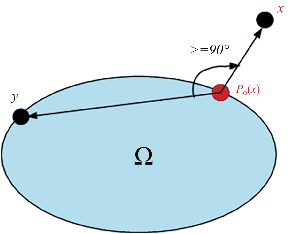 Алгоритмы решения задач A и B, исходно предложенные в литературе, основывались на последовательных проекциях. Напомним фундаментальный результат о проектировании на выпуклое множество и определение проекционного оператора. Для любого замкнутого выпуклого множества и оператор проектирования сопоставляет точке ближайший элемент из Ω, т.е1. . Минимум расстояния всегда достигается, а ближайшая точка единственна. Это утверждение справедливо в произвольном гильбертовом пространстве (см. [31], теорема 1.4.1).