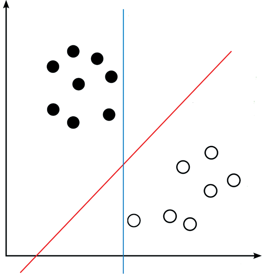 Равенство , очевидно, может быть записано как пара неравенств, таким образом, метод из [38], [39] позволяет находить решения произвольной системы линейных уравнений и неравенств (в предположении, что такое решение существует). Отметим, что к решению неравенств сводятся многие “линейные” задачи обучения (например, алгоритмы настройки весов перцептрона), классификации и математической диагностики (см. [2], [4]–[6]). В этих задачах требуется найти гиперплоскость, разделяющую две группы точек в многомерном пространстве (фиг. 5). Задавая гиперплоскость линейным уравнением, условие разделения является системой неравенств на коэффициенты этого уравнения.
