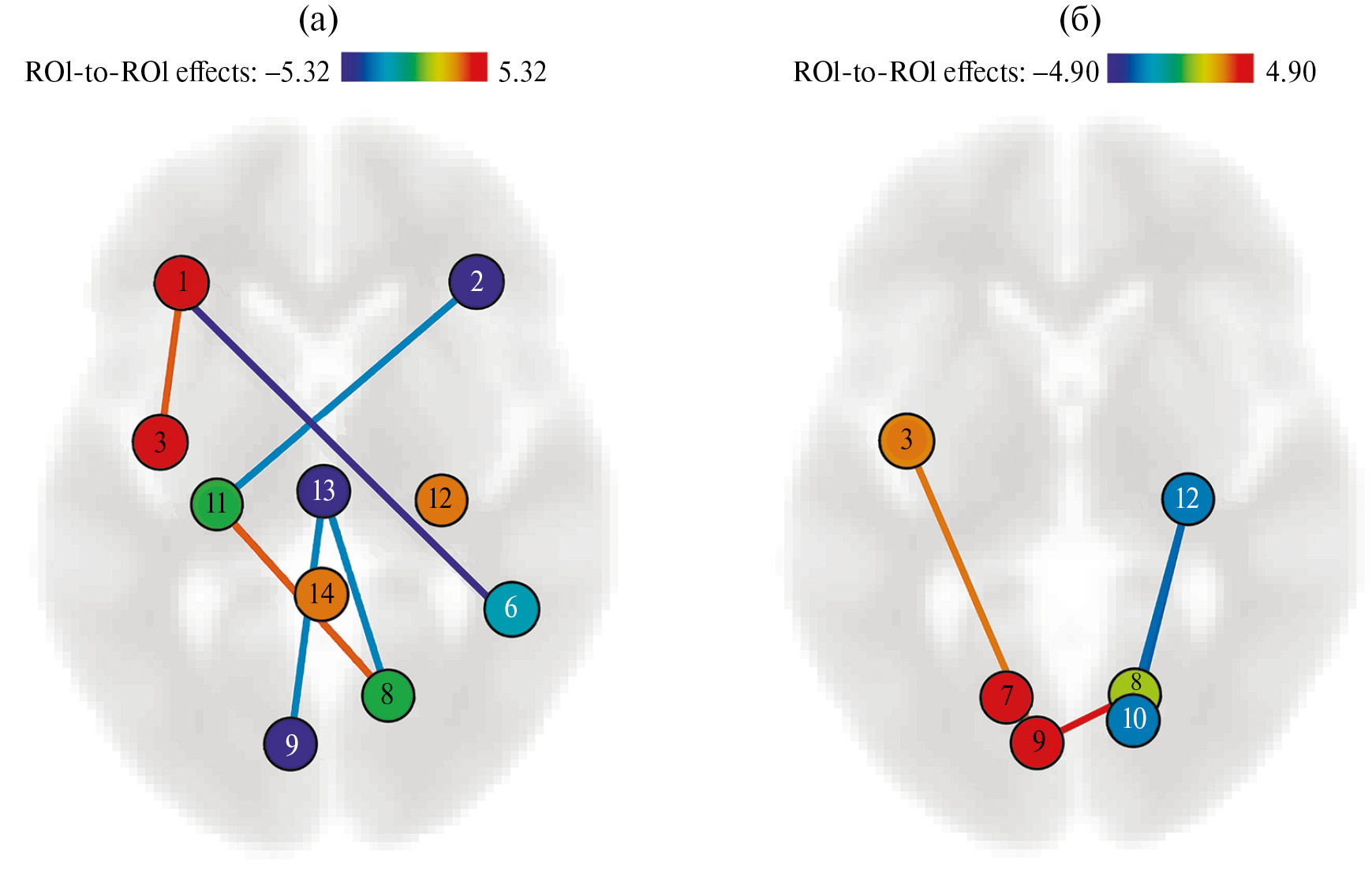 Результаты статистической проверки этих изменений по критерию Стъюдента для парных сравнений представлены на рис. 4. Видно, что в группе с левополушарной опухолью (рис. 4 (а)) подтверждается отмеченное на рис. 3 дальнейшее ослабление протяженных межполушарных функциональных связей лобных областей обоих полушарий, а также взаимодействий таламуса со зрительной корой. Вместе с тем коннективности между левой лобной и премоторной корой, а также левым гиппокампом и зрительной корой справа усиливаются. При правостороннем повреждении (рис. 4 (б)) достоверны односторонние изменения: ослабление патологической (отсутствовавшей в норме) связи гиппокампа и зрительной коры справа, моторной и зрительной коры слева. Подтверждается также тенденция к нормализации (усиление) связей симметричных зрительных областей коры. Следует отметить, что после применения поправки на множественные сравнения при сопоставлении показателей коннективности до и после РТ значимых изменений не обнаружено, что, по нашему мнению, связано с малым размером выборки.