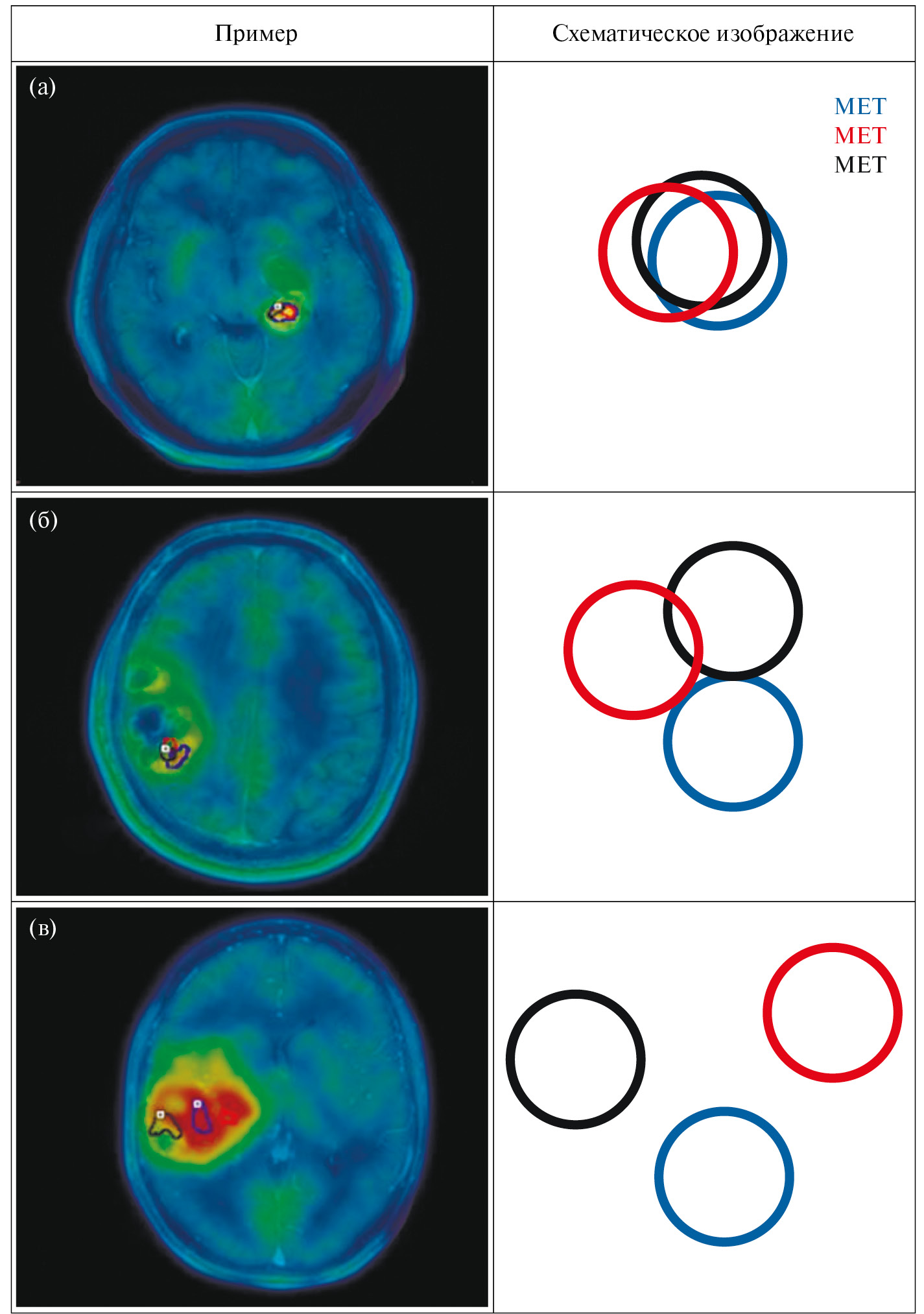 Рис. 2. Совмещенные ПЭТ и МРТ изображений. Схематическое представление сопоставления зон интереса (VOI) максимального кровотока (CBFmax – красный контур), измеряемого коэффициента диффузии (ADCmin – черный контур), метаболической активности метионина в опухоли (METmax – синий контур): (а) совпадение VOI, (б) частичное совпадение VOI, (в) Отсутствие совпадения VOI.