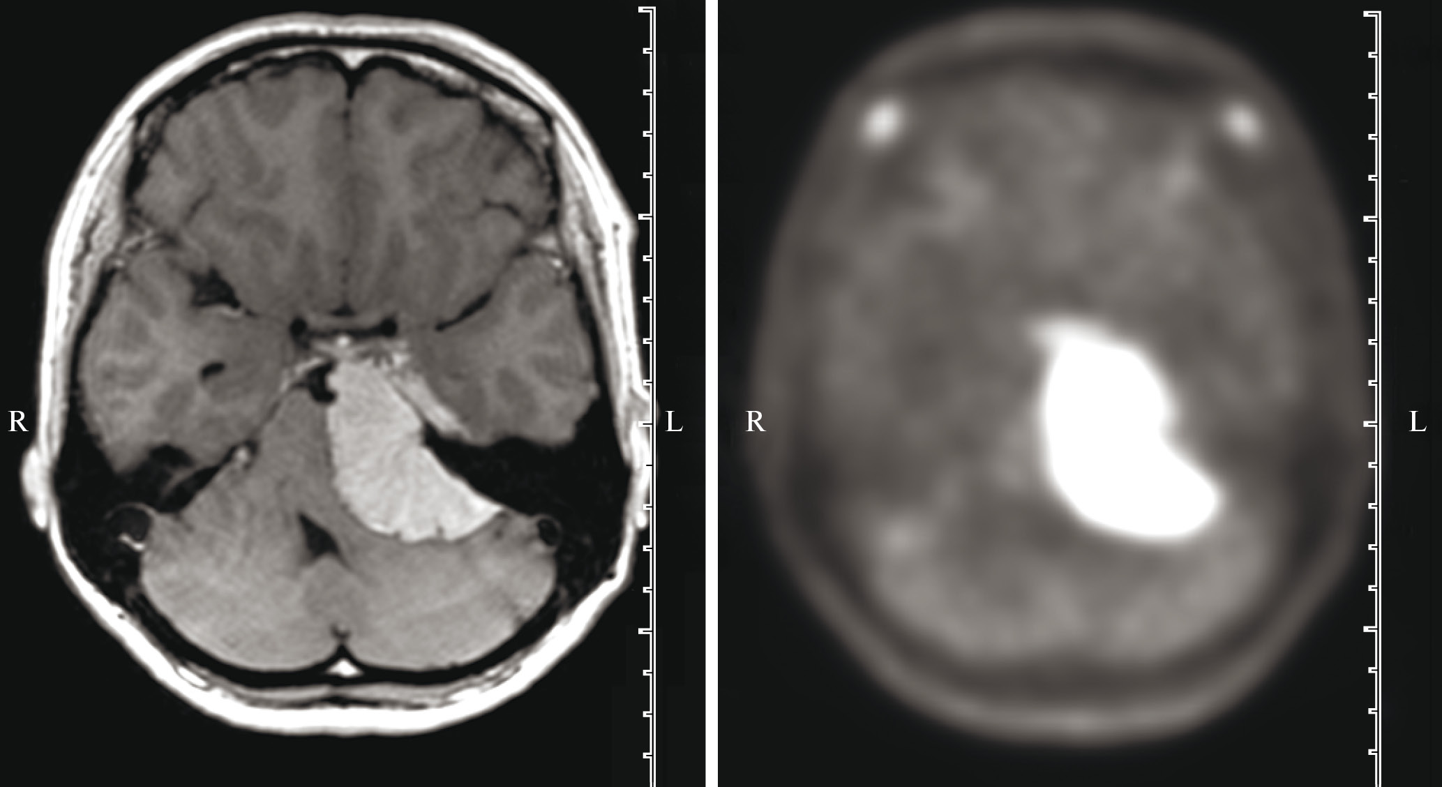 Fig. 1. WHO grade 1 petroclival meningioma on MRI (left) and PET/CT with 11C-methionine (right). PET/CT shows a high tumor-to-brain ratio of 5.5.