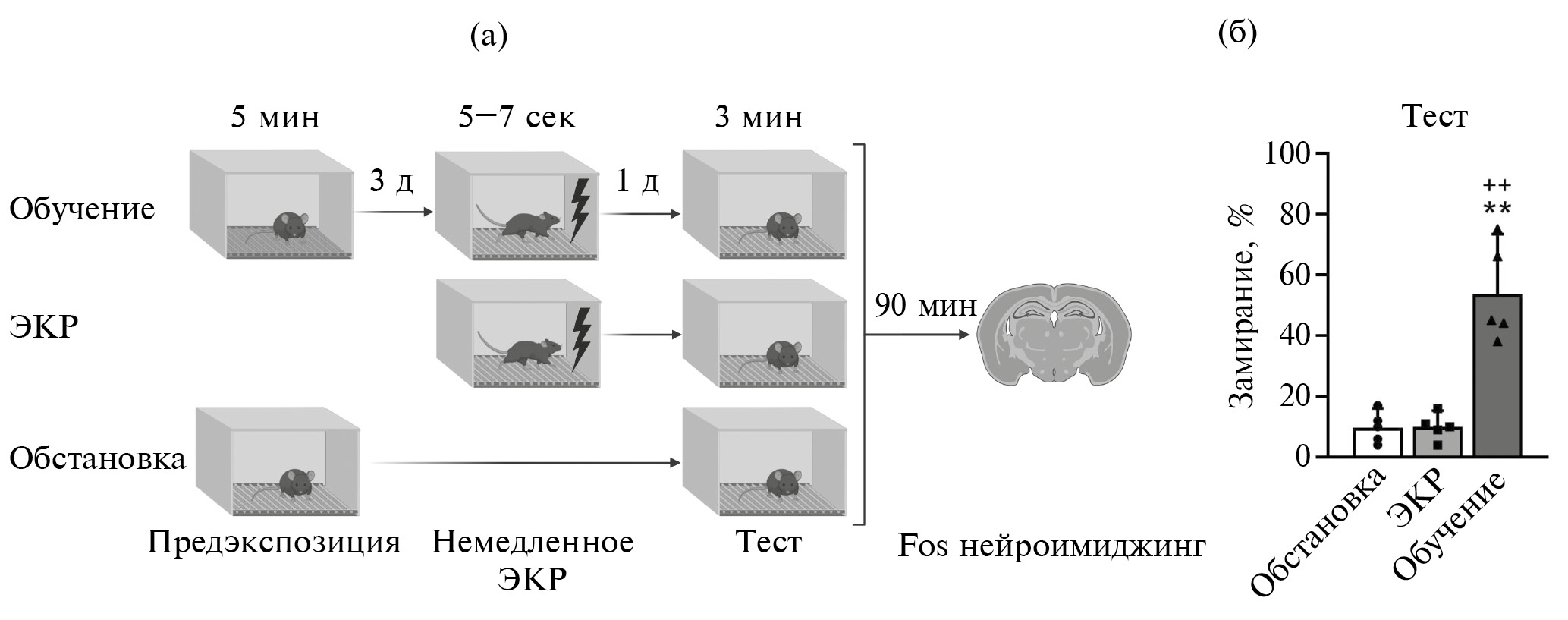 Рис. 1. Схема эксперимента (а) и данные о поведении мышей трех групп при тестировании ассоциативной памяти об обстановке (б). Предэкспозиция – предварительное неподкрепляемое обследование новой обстановки, Немедленное ЭКР – нанесение немедленного ЭКР в ранее обследованной обстановке, Тест – тестирование памяти об обстановке. ** – p = 0.008 по сравнению с группой “Обстановка”, ++ – p = 0.007 по сравнению с группой “ЭКР”, апостериорный критерий Тамхейна Т2.
