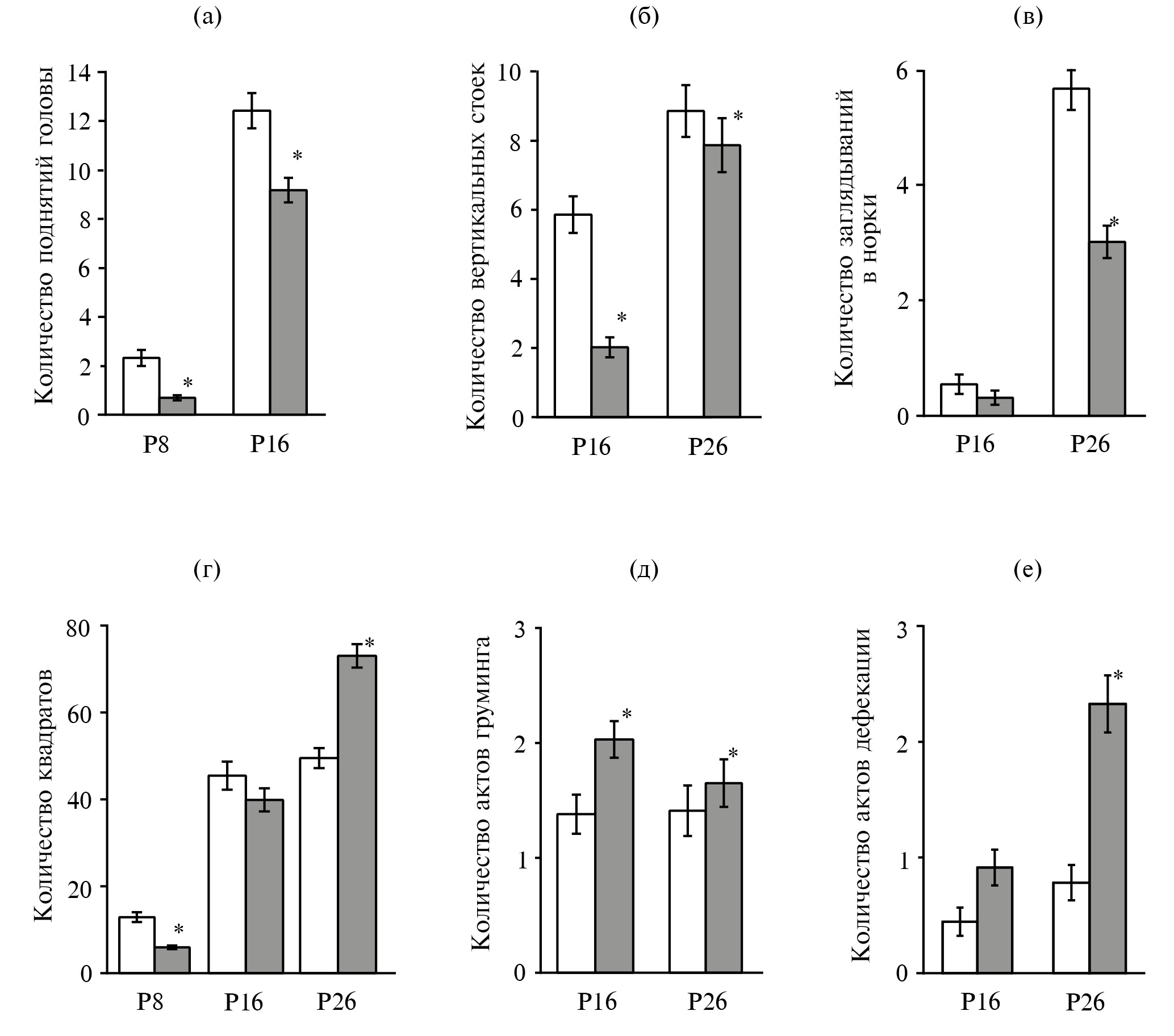 3. Fig. 2. Changes in motor and exploratory activity, level of anxiety in the “open field” test in rats in the control and HcyF2 groups. Number of head elevations (a), vertical stands (б), explored holes “head dips” (в), crossed squares (г), acts of grooming (д) and defecation (е). P8, P16, P26 – age periods. White bar – control group, gray bar – HcyF2 group. * p < 0.05 relative to the control group.