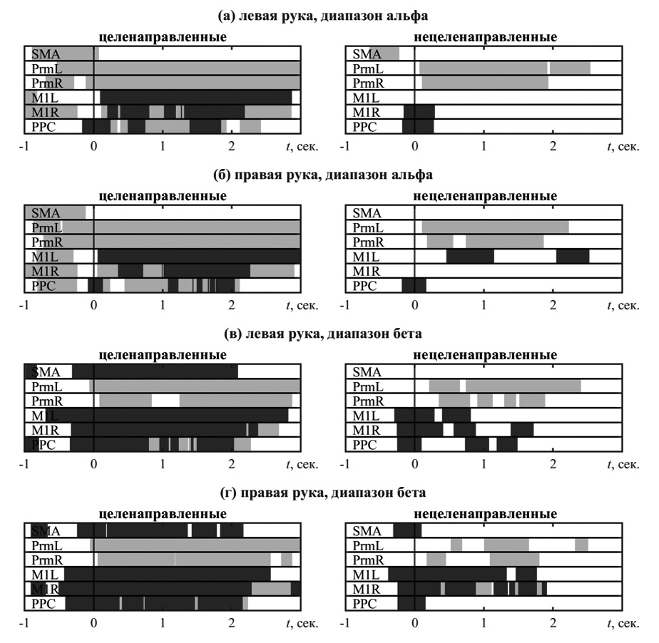 При воображении нецелевого движения (рис. 1 (в, г)) также наблюдается билатеральная и асимметричная десинхронизация М1, однако длительность десинхронизации всего 2 сек, причем десинхронизация в ипсилатеральном полушарии заканчивается еще раньше. Еще короче десинхронизация в SMA и в PPC. Десинхронизация в PrmL отсутствует. Наблюдается нестойкая десинхронизация PrmR во время воображаемого нецеленаправленного движения левой руки.