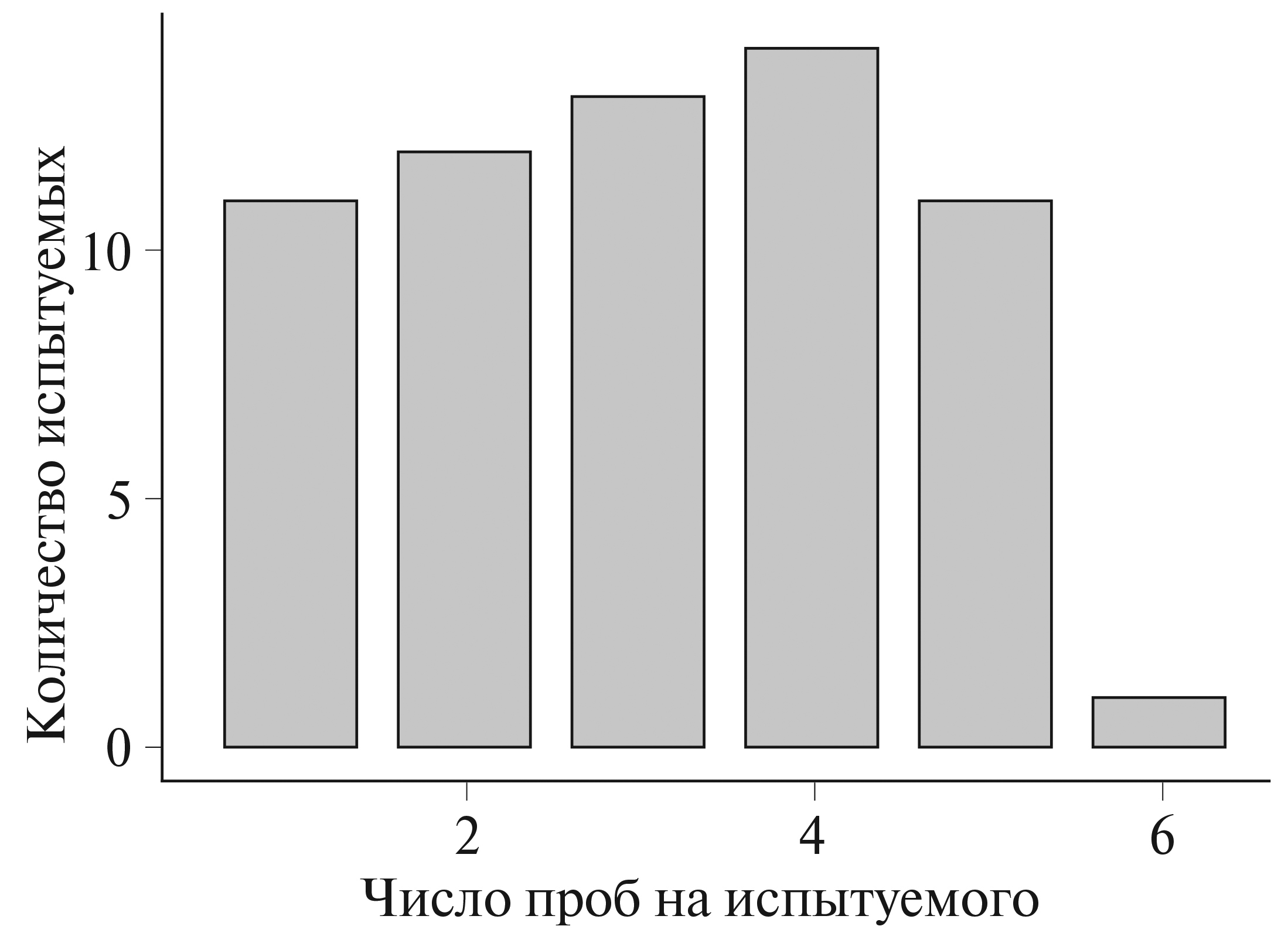 Рис. 1. Распределение количества проб по испытуемым. По оси X представлено число проб, по оси Y – количество испытуемых с таким количеством проб.