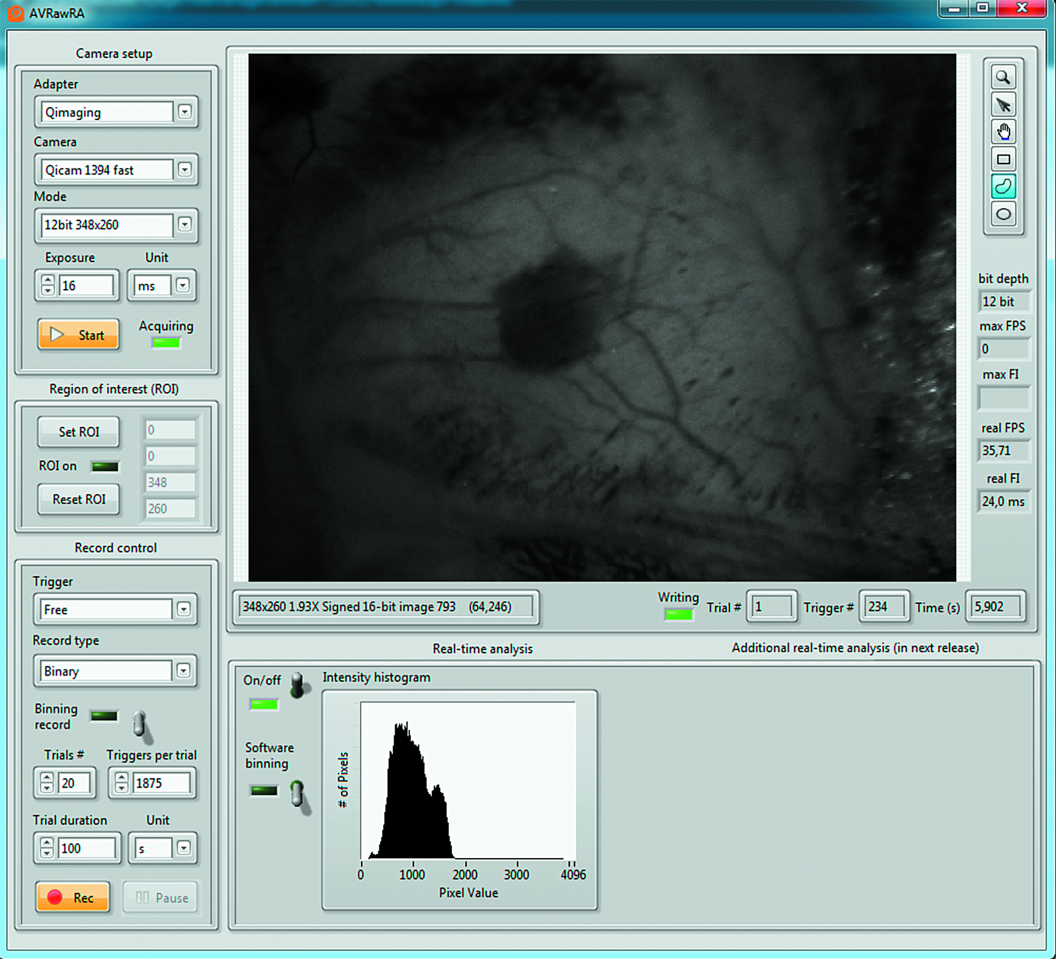 AVRawRA graphical user interface contains panel for setup main camera features, panel for setup region of interest (ROI), panel for the record configuration, panel for real-time image visualization and panel for real-time analysis (Fig. 1).