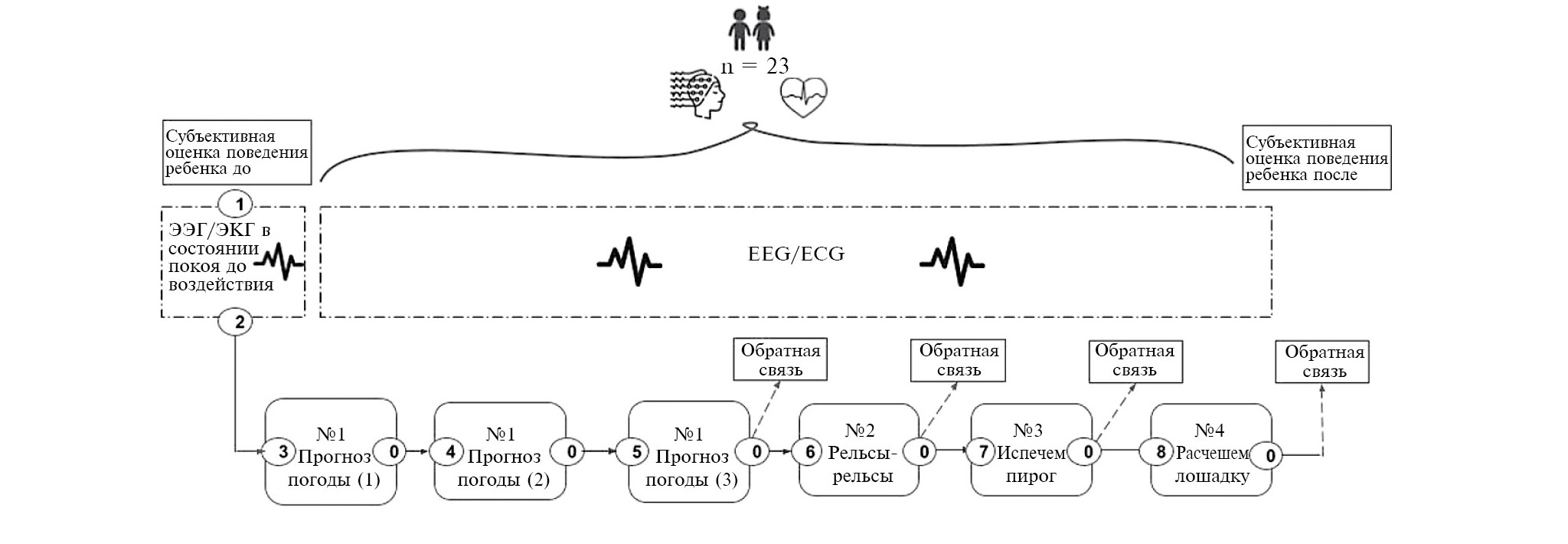 Участникам эксперимента было предъявлено 4 различных массажных истории на спине. ЭЭГ данные записывались с помощью cистемы губчатых электродов R-net, 64 канала (Brain Products GmbH). Частота дискредитизации – 1000 Гц. Параметры фильтрации сигнала ЭЭГ – 0.5–70. Перед началом тактильной стимуляции записывалась электрическая активность мозга при открытых (метка 1) и закрытых (метка 2) глазах, после чего ребенку поочередно предъявлялись истории. Первая история делилась на 3 части, соответственно, ставились метки 3, 4, 5. Вторая история – метка 6, третья история – метка 7, четвертая история – метка 8. Окончание каждой истории отмечалось меткой 0 (рис. 3). Исследование проведено с использованием оборудования НИЦ № 40606 Института Высшей нервной деятельности и нейрофизиологии РАН «Функциональное картирование мозга».
