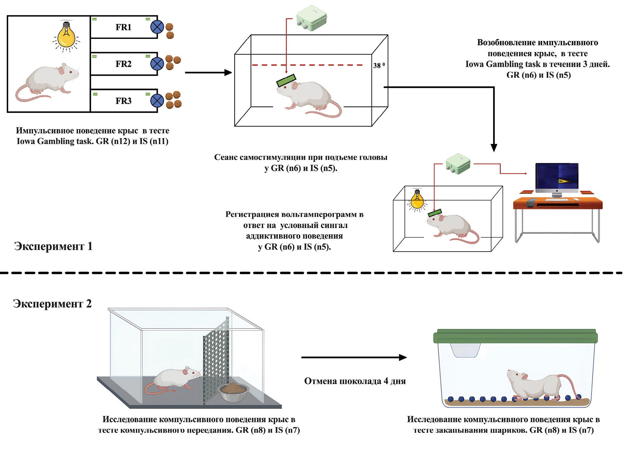Действие стрессоров в раннем возрасте повышает вероятность формирования психических и аффективных расстройств, употребление алкоголя и психоактивных средств (Watt et al., 2017). Показано, что эмоциональные стрессы в раннем онтогенезе коррелируют с распространением алкогольной и наркотической зависимости (Douglas et al., 2010). Выращивание грызунов в условиях социальной изоляции (IS) может служить моделью хронического стресса (Григорьян и др., 2022; Lebedev et al., 2023). У животных IS наблюдается повышенное потребление алкоголя и самовведение кокаина (Butler et al., 2016), тревожное и депрессивно-подобное поведение (Krupina et al., 2020; Павлова и др., 2022), снижение адаптации в среде (Han et al., 2012), повышение потребления пищи (Лебедев и др., 2021). У IS отмечен комплекс поведения с агрессивностью и увеличением активности, но при этом – с повышенной депрессивностью и тревожностью, так называемый «синдром социальной изоляции». Он развивается на основе повышения чувствительности звеньев подкрепляющей системы мозга (Шабанов и др., 2004). Наличие синдрома создает предпосылки для формирования у животных IS аддиктивного поведения, химических и нехимических зависимостей и предполагает возможность изучения у них аддиктивных расстройств поведения (Пюрвеев и др., 2023). Действие алкоголя и прихотропных средств у животных IS было показано ранее, в то же время нехимические зависимости (такие как пищевая, игровая и др.) не получили должной разработки. При исследовании нехимической зависимости объектом изучения является поведенческий паттерн, а не психоактивное вещество. Нехимические зависимости имеют много общего с химическими: механизмы формирования, наличие синдрома отмены, а также общие психофизиологические и нейробиологические характеристики (Егоров, 2020).