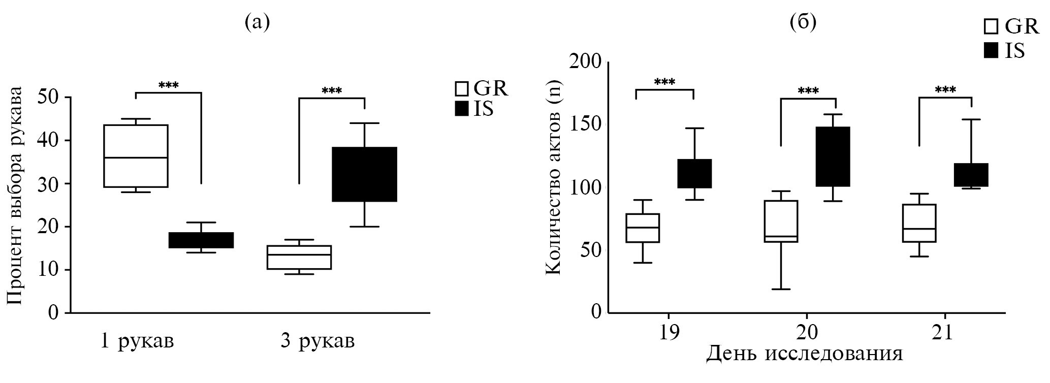В первые дни обучения животных в лабиринте для регистрации элементов игровой зависимости у животных наблюдалась двигательная активность и обнюхивания на стартовой площадке с наличием заходов в рукава лабиринта. Крыс, предпочитавших получать подкрепление в 1-м рукаве с низким вознаграждением, но наибольшей его вероятностью рассматривали как животных со снижением импульсивности. Появление импульсивности было связано с заходами в 3-й рукав с более высоким подкреплением (4 семени), но с самой низкой вероятностью. При этом животные совершали многочисленные заходы в 3-й рукав лабиринта при очевидном снижении общего числа полученного вознаграждения по сравнению с крысами, предпочитавшими заходы в 1-й и даже во 2-й рукав. Животные GR в 2.3 раза больше заходили в 1-й рукав лабиринта по сравнению с IS (р < 0.001 по критерию Манн–Уитни) и получали пищевое подкрепление с высокой степенью вероятности, но с низким вознаграждением. Животные IS по сравнению с GR в 2 раза больше заходили в 3-й рукав лабиринта (р < 0.001 по критерию Манн–Уитни) и получали пищевое подкрепление с низкой степенью его вероятности, но с высоким вознаграждением (рис. 3 (а)). При тестировании животных в последние дни обучения выявлено, что отличия у животных IS по сравнению с GR по числу заходов в 3-й рукав лабиринта было стабильно и воспроизводимо (р < 0.001 по критерию Манн–Уитни) (рис. 3 (б)).
