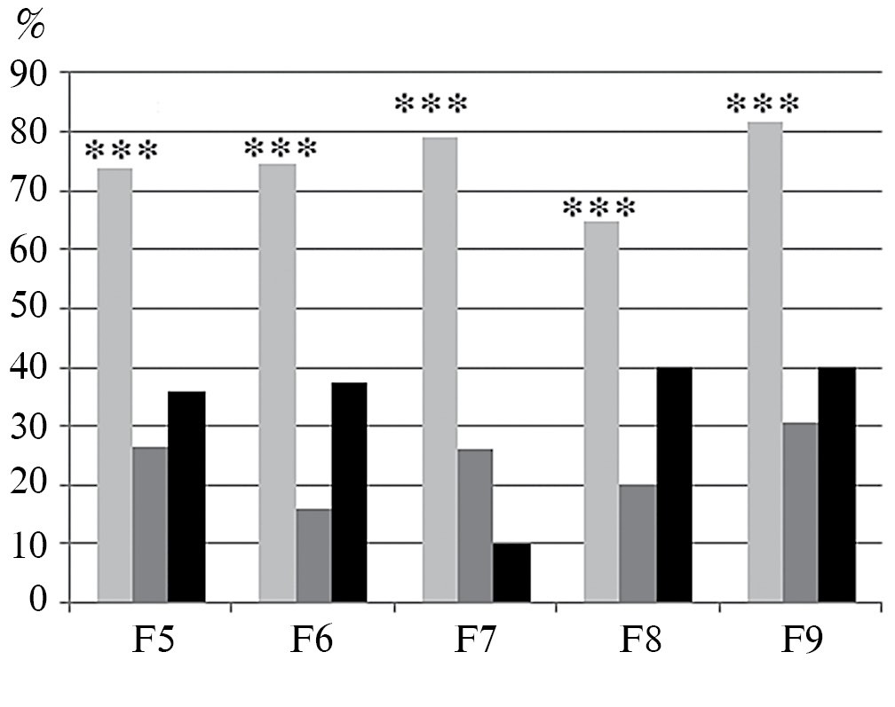 Рис. 3. Доли мышей (%, ось ординат), у которых ЛП решения теста ПВУ с пробкой при его втором предъявлении был короче, чем при первом. Светло-серые столбики – линия “плюс” (F6, n = 14, F7, n = 16, F9, n = 10), темно-серые – линия “минус”, черные – неселектированная генетически гетерогенная контрольная популяция. *** – статистически значимые отличия от показателей линии «минус» и контрольной популяции (тест φ Фишера для оценки разницы альтернативных долей)
