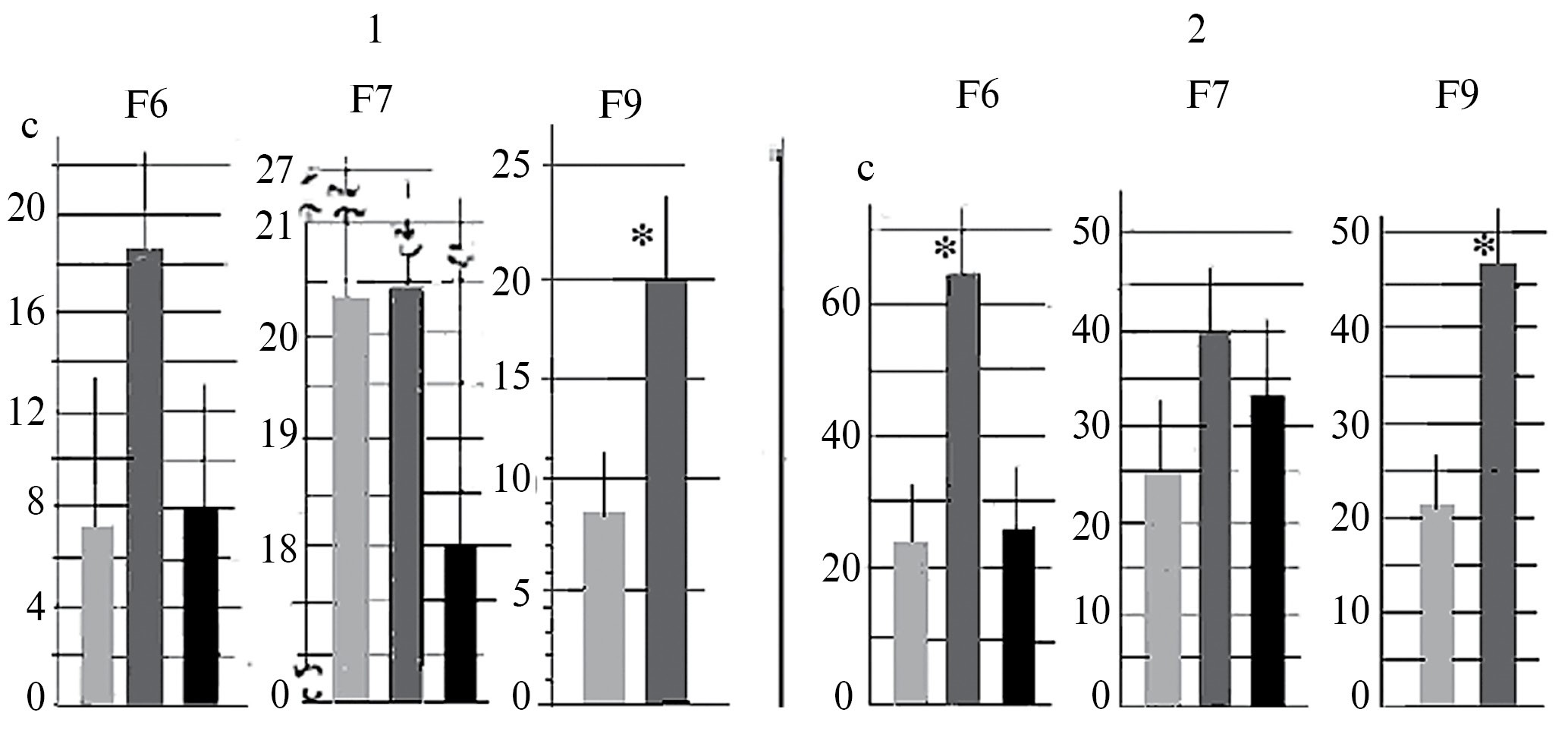 Fig. 5. The mean scores contact numbers (ordinate, mean ± st.err.) with the object in mice of F6, F7 and F9 during 40 sec of its movement along the box perimeter. 1 – the object, shown as the first, 2 – the object, shown as the fifth. Designations as in Fig. 3
