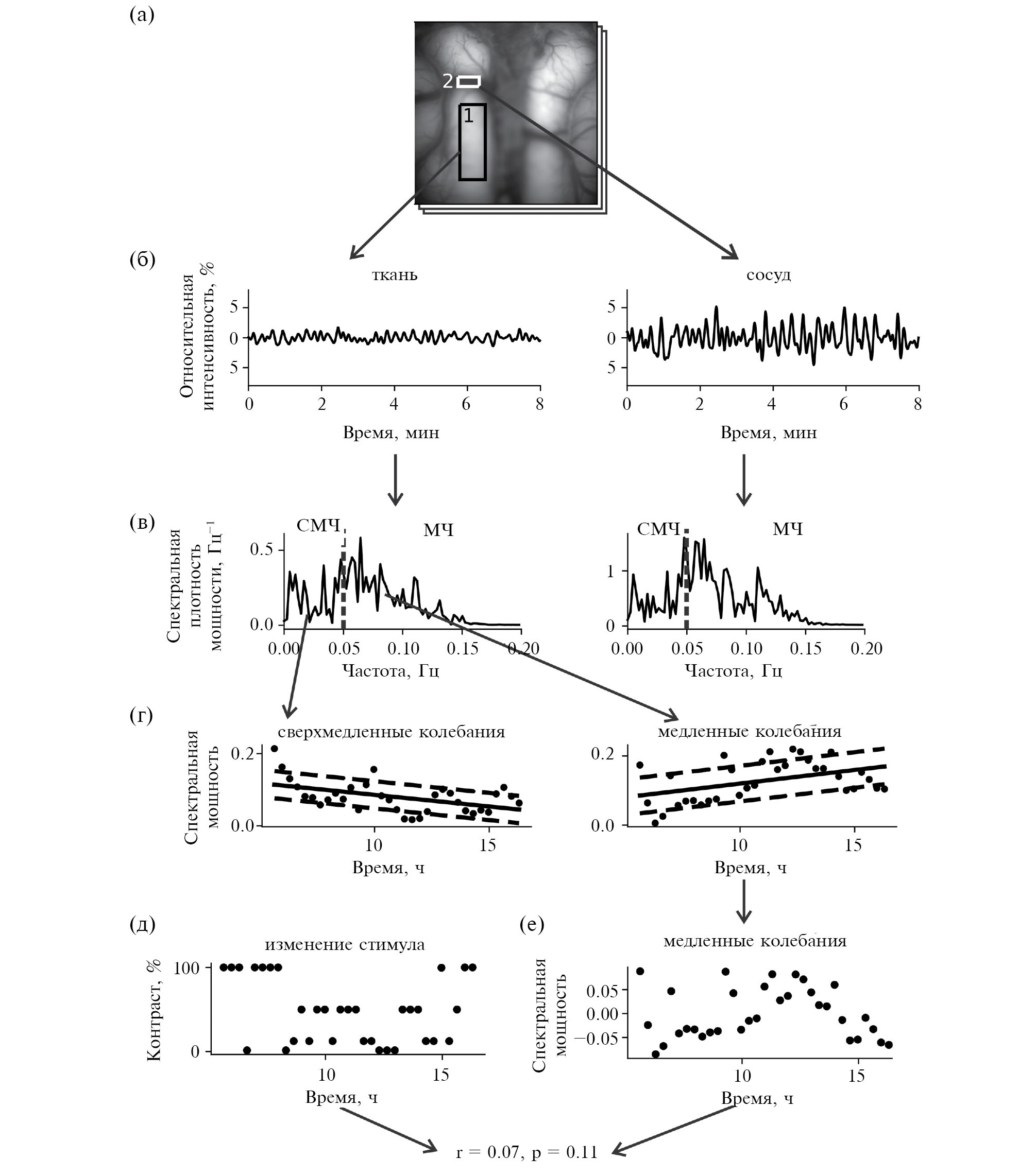 Рис. 1. Представление амплитуды оптического сигнала и зависимости мощности вазомоторных колебаний от параметров стимуляции (первая серия): (а) – изображение видимой части коры, зарегистрированное при помощи метода оптического картирования по внутреннему сигналу, на котором прямоугольниками с цифрами 1, 2 отмечены выбранные нами области интереса (ROI): 1 – ROIткань (ROI в нервной ткани), 2 – ROIсосуд (ROI в сосуде); (б) – пример вазомоторных колебаний, зарегистрированных из нервной ткани (левый график) и из кровеносного сосуда (правый график). По оси ординат – относительное изменение внутреннего оптического сигнала, в % от ее среднего значения; (в) – спектрограммы для вазомоторных колебаний, зарегистрированных из нервной ткани (левый график) и из кровеносного сосуда (правый график). Вертикальная пунктирная линия разделяет диапазоны сверхмедленных (СМЧ) и медленных (МЧ) колебаний; (г) – динамика мощности сверхмедленных (слева) и медленных (справа) вазомоторных колебаний, зарегистрированных из нервной ткани. Точками отмечена сама динамика, точки соответствуют отдельным экспериментальным сессиям. Толстая прямая – это линия регрессионной зависимости, полученная при помощи метода линейной регрессии. Пунктирные линии отстоят от линии регрессионной зависимости на величину среднеквадратического отклонения реального графика от регрессионной зависимости. По оси абсцисс – время начала сессии; (д) – изменение контраста решетки за время проведения эксперимента; (е) – зависимость немонотонных изменений мощности медленных (МЧ) колебаний от времени