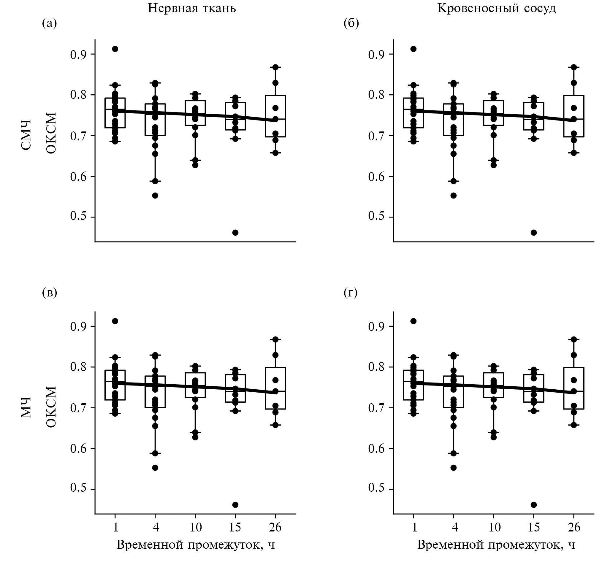 Однако для медленных колебаний ситуация прямо противоположная (рис. 4 (в), (г)): у них при увеличении промежутка ОКСМ снижается как у колебаний, зарегистрированных в нервной ткани (p < 6×10–5; тест Фридмана), так и у колебаний в сосуде (p < 0.005).