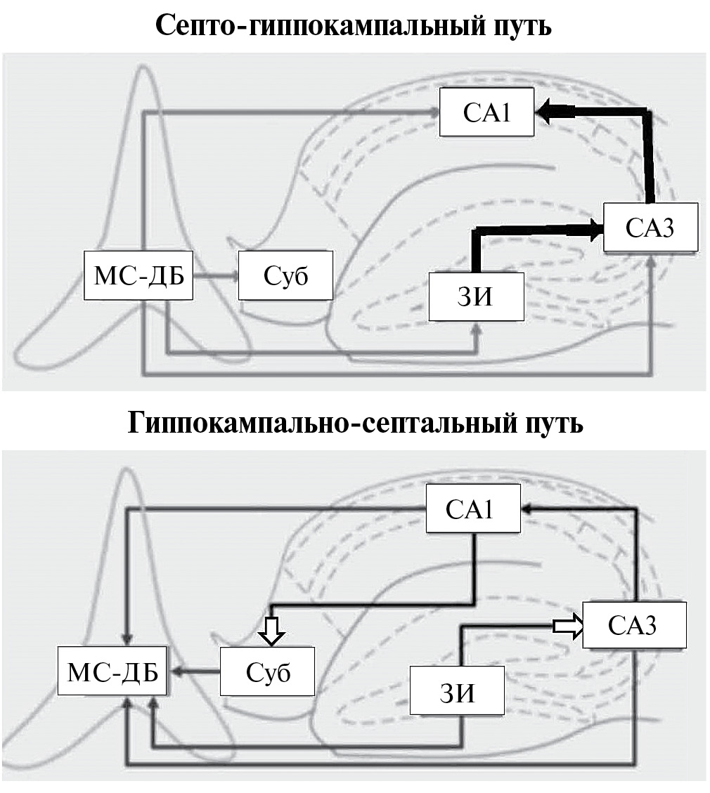 Рис. 2. Связи МС-ДБ с гиппокампальной формацией. Вверху – эфферентные пути МС-ДБ (септо-гиппокампальный путь); серые стрелки обозначают прямые пути от гиппокампальной формации к МС-ДБ; черные стрелки – непрямые пути. Внизу – афферентные пути МС-ДБ (гиппокампально-септальный путь); черные стрелки обозначают прямые пути; светлые стрелки (от СА1 к Суб и от ЗИ к СА3) – непрямые пути к МС-ДБ. Обозначения: СА1 – поле СА1 гиппокампа; СА3 – поле СА3 гиппокампа; ЗИ – зубчатая извилина; Суб – субикулум.
