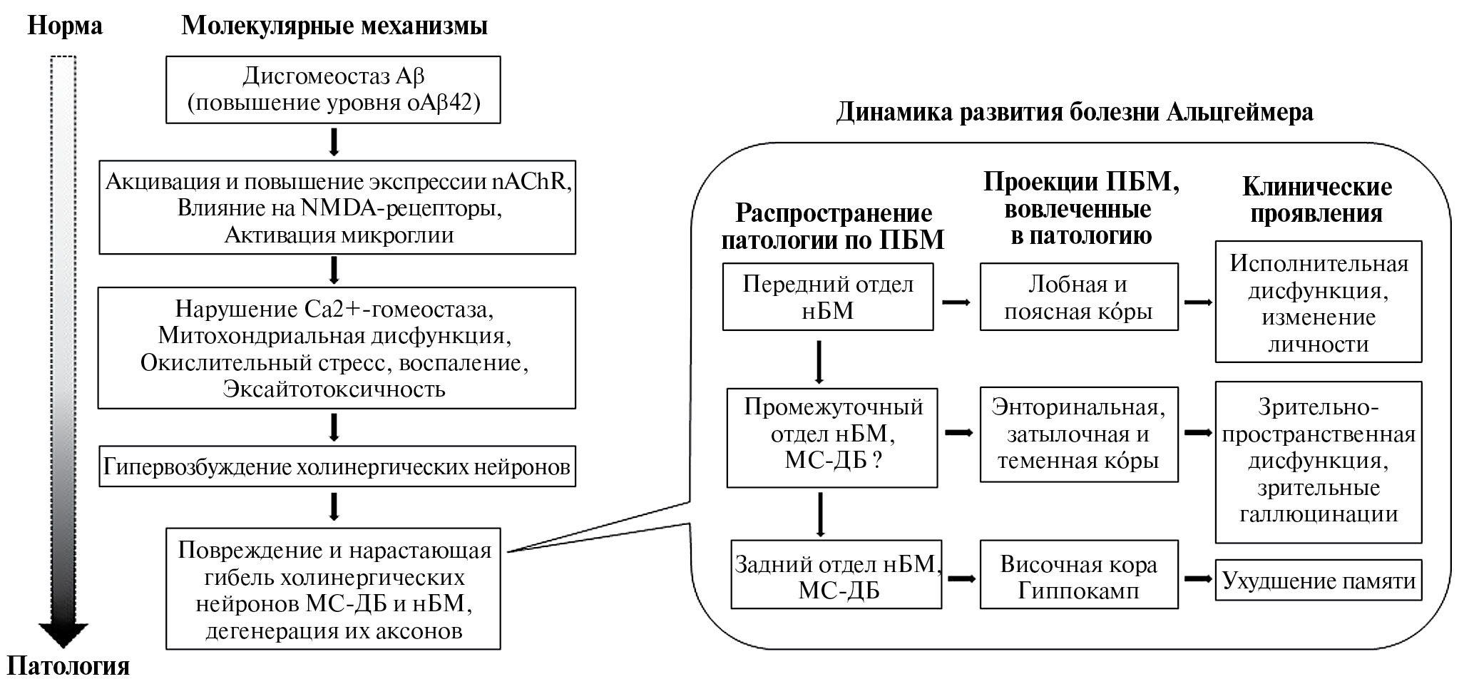 Однако холинергическая гипотеза развития БА и рекомендация повышения уровня ацетилхолина (АХ) при терапии этого заболевания нуждаются в подтверждении. Более того, кроме холинергических проекций нейроны ПБМ снабжают структуры мозга другими медиаторами, такими как гамма-аминомасляная кислота (ГАМК) и глутамат, так что гибель нейронов ПБМ лишает мозг целого набора нейрохимических агентов. Кроме этого, возникновение БА может быть обусловлено не только гибелью нейронов и разрушением нейронных связей, но и патологической активностью структур ПБМ, а также различными другими морфофункциональными отклонениями в этой области. В современной литературе отсутствуют суммарные сведения о роли ПБМ в патогенезе БА, что, возможно, является одной из причин непонимания механизмов развития этой болезни и отсутствия надежных средств ее предотвращения и лечения. В настоящем обзоре всесторонне рассматривается участие ПБМ и его связей с другими областями мозга в возникновении и прогрессировании БА; это может продвинуть разработку терапевтических подходов для лечения данной болезни.