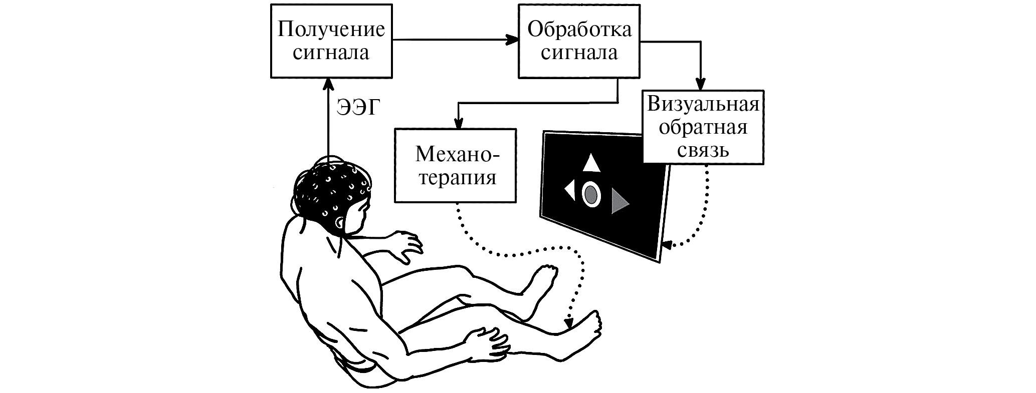 Совместно с нейроинтерфейсами используются ФЭС (Do et al., 2011; 2012; Takahashi et al., 2012; King et al., 2014; 2015; McCrimmon et al., 2014; 2015; Mrachacz-Kersting et al., 2016; Ren et al., 2020; Chung et al., 2020; Carrere et al., 2021; Biswas et al., 2024), тактильная стимуляция опорной поверхности стоп (Cheron et al., 2012), виртуальная реальность (Ferrero et al., 2021, 2023; Ren et al., 2020; Donati et al., 2016; Wang et al., 2010; King et al., 2013) и роботизированные устройства (Do et al., 2013; Xu et al., 2014; García-Cossio et al., 2015; Donati et al., 2016; Ferrero et al., 2023, Barria et al., 2021; Choi et al., 2020, Боброва и др., 2023). Большинство роботизированных устройств (экзоскелеты, ортезы), использующихся с нейроинтерфейсами, обеспечивают перемещение нижних конечностей в положении стоя с разгрузкой веса тела (подвесы). Обнаружено лишь одно исследование (Barria et al., 2021), в котором совместно с нейроинтерфейсом использовался ортез, обеспечивающий перемещения лишь в голеностопном суставе и дающий возможность пациенту находиться в положении сидя или лежа. Использованный в нашем пилотном исследовании (Боброва и др., 2023) и в данной работе механотренажер «БиоКин» позволяет осуществлять пассивную локомоцию в положении сидя или лежа путем изменения суставных углов всех крупных суставов нижних конечностей.