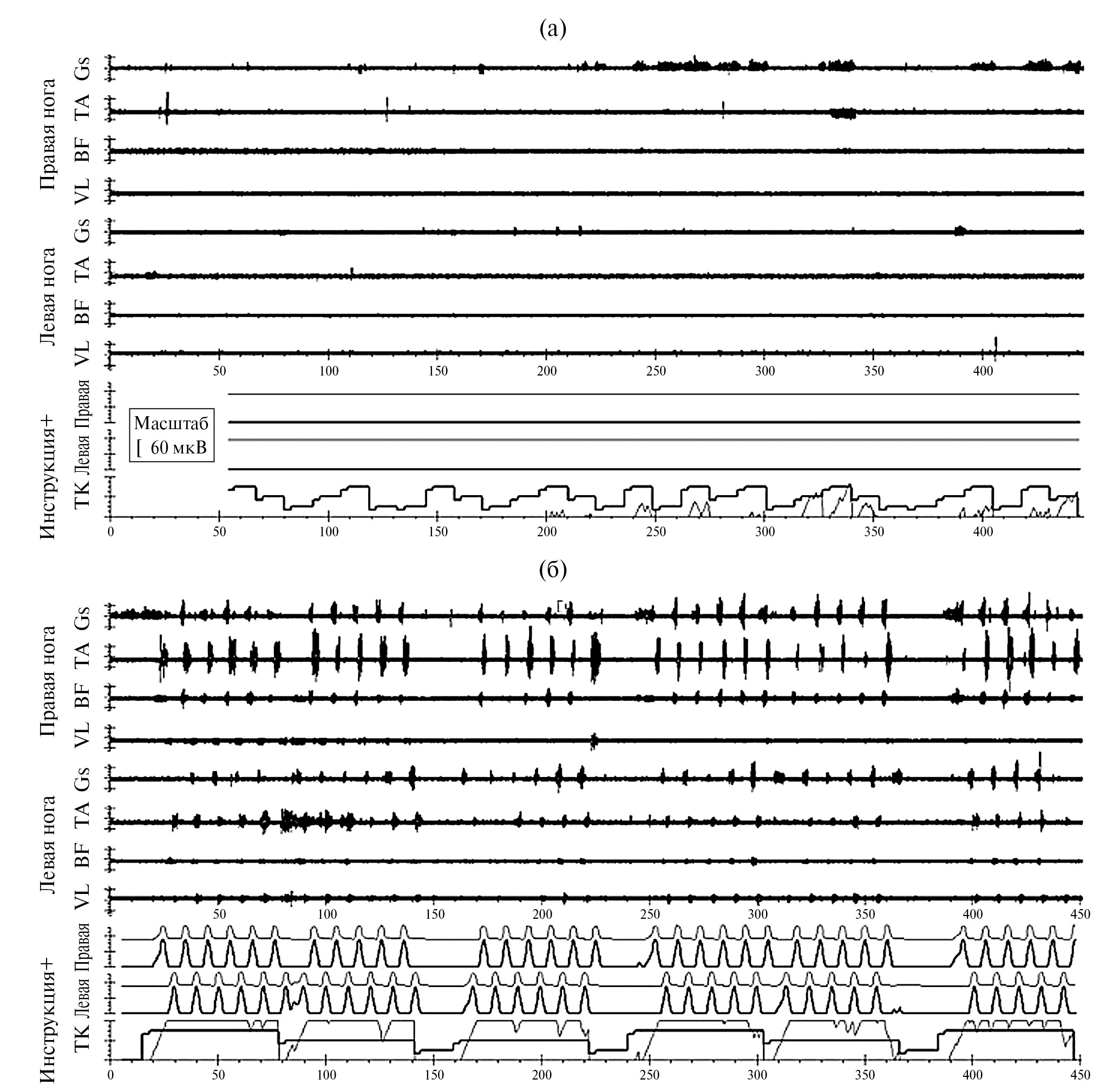 ЭМГ-активность мышц правой и левой ноги: передних большеберцовых (tibialis anterior, TA), икроножных (gastrocnemius, Gs), латеральных широких мышц бедра (vastus lateralis, VL) и двуглавых мышц бедра (biceps femoris, BF) – регистрировали с помощью беспроводного миографа DELSYS Trigno.