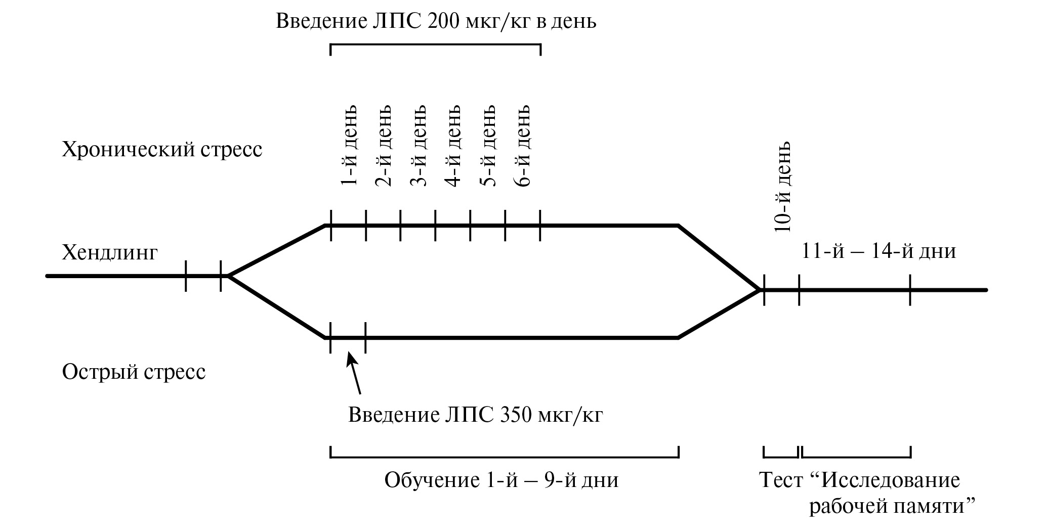 В возрасте 25 дней 40 крыс помещали на 20 дней в обогащенную среду (ОС). Их содержали в 4 трехъярусных клетках размером 60 х 38 х 90 см, которые были оборудованы беличьим колесом, лесенками, материалом для зарывания, игрушками и гамаками. В одной большой клетке находилось 10 крыс из одной группы. Другую группу такого же возраста из 40 животных содержали в стандартных условиях (СТАНД) в домашней клетке размером 51 х 40.5 х 30 см по 5 крыс в клетке без бегового колеса и других дополнительных предметов в клетке. Острый ПВС у крыс обеих групп (ОС и СТАНД) (n = 10 в каждой группе) вызывали введением бактериального ЛПС, выделенного из наружной оболочки Escherichia coli (кишечная палочка) (ЛПС, 350 мкг/кг) однократно за 1 час до начала обучения (ЛПС-О). Контрольным животным вводили физраствор в том же объеме (ФИЗ-О). Хронический ПВС (ЛПС-Х) вызывали многократным (в течение 6 дней) введением ЛПС в дозе 200 мкг/кг за 1 час до начала поведенческих тестов. Контрольным крысам столько же раз вводили физраствор (ФИЗ-Х). Таким образом, всего в экспериментах участвовало 8 групп животных: 4 группы со СТАНД-условиями проживания и 4 группы с проживанием в ОС.