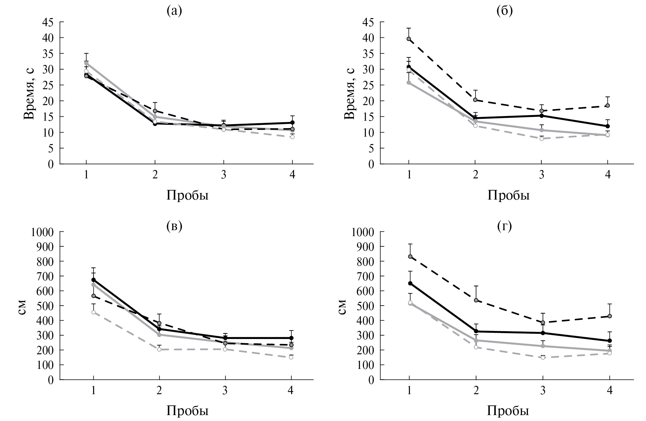 ANOVA-анализ показал статистически значимое снижение времени достижения платформы и проплываемого расстояния от первой к четвертой пробе (фактор ПРОБА): F(3, 1279) = 121.30, p = 0.0000 по времени достижения платформы и F(3, 1279) = 73.392, p = 0.0000 по дистанции (рис. 4). Фактор ДНИ, отражающий время нахождения платформы и проплываемого до нее расстояния в каждый опытный день, оказался также статистически значимым, F(3, 1279) = 7.2054, p = 0.00009 и F(3, 1279) = 7.4531, p = 0.00006. Это говорит о том, что обучение нахождению платформы с использованием рабочей памяти улучшалось не только при переходе от 1-й пробы к 4-й ежедневно, но и от 1-го к 4-му дню экспериментов.