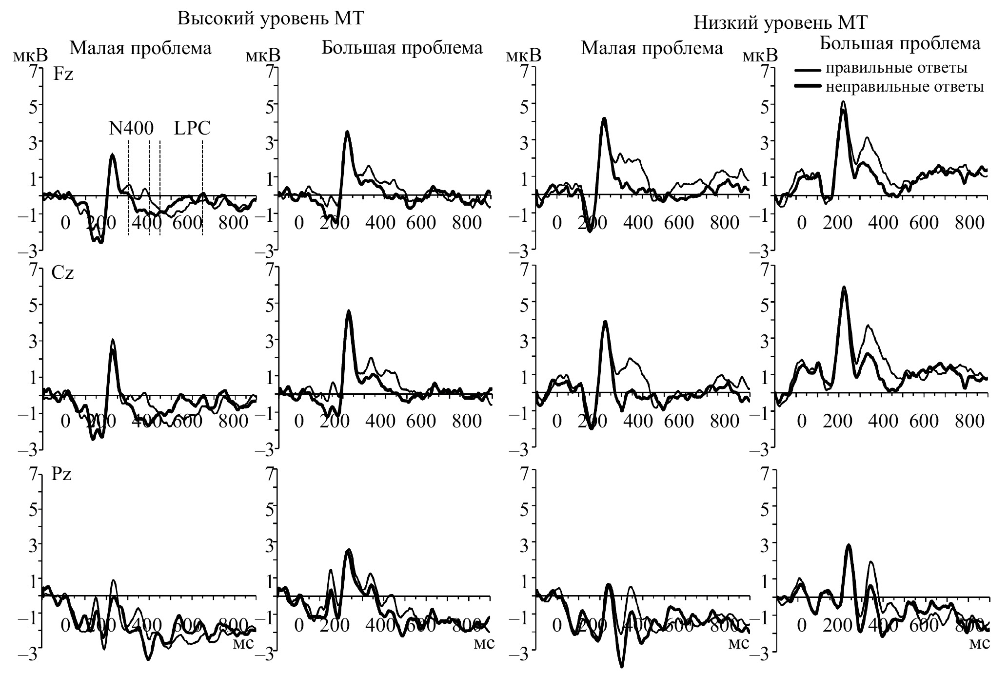 Предыдущие исследования показали, что при решении примеров на сложение двузначных чисел участники эксперимента с высоким уровнем МТ показывают меньшую амплитуду LPC при предъявлении неправильных решений по сравнению с участниками эксперимента с низким уровнем МТ (Núñez-Peña, Suárez-Pellicioni, 2015). Предполагается, что неправильные решения кажутся более правдоподобными для людей с высоким уровнем МТ, что выражается в снижении амплитуды волны LPC в ответ на их предъявление (Núñez-Peña, Suárez-Pellicioni, 2015). Авторы связывают такое отличие между двумя группами с меньшей арифметической компетенцией участников эксперимента с высоким уровнем МТ, что повторяет результаты исследований, направленных на выявление связи волны LPC с арифметическим навыком (Núñez-Peña и Suárez-Pellicioni, 2012).