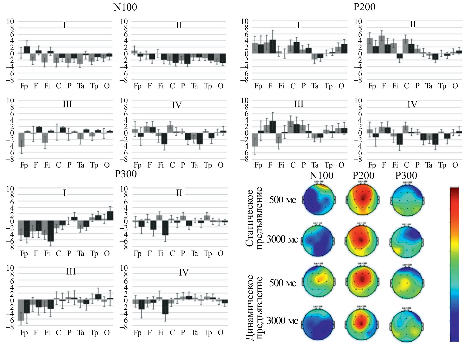 Fig. 3. The task of maintaining and reproducing broken lines. Averaged values of three ERP components of the ERP to an imperative signal (in μV) and their amplitude maps. Error bars reflect two-sided SEM values. For each component I, III – 500 ms delay; II, IV – 3000 ms delay; I, II – static mode; III, IV – dynamic mode. Gray columns – left hemisphere, black columns – right hemisphere. Designations of the pseudoleads: Fp – Fp1/2; F – F3/4: Fi – F7/8; C – C3/4; P – P3/4; Ta – T3/4; Tp – T5/6, O – O1/O2. The color scale characterizes the amplitude of the corresponding component, normalized to the absolute value of the maximum deviation of this component from zero, blue – deviation towards negative values, red – towards positive values.