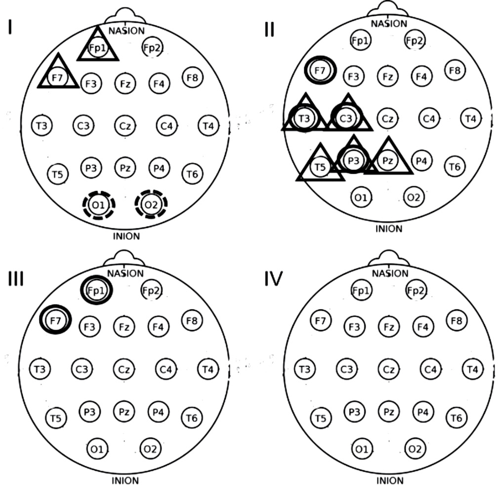 Fig. 5. Topography of the significant ERP changes due to the retention time and mode of presentation of the broken lines and the letter sequences. Designations: I, II – the influence of DURATION; III, IV – the influence of MODE; I, III – retention of broken lines; II, IV – retention of letter sequences. Data on statistical significance of ERP differences in individual leads are given in the text of RESULTS section. Circle – P200, triangle – P300. Solid line – ERP value is higher with delay duration of 3000 ms, dotted line – with delay duration of 500 ms.