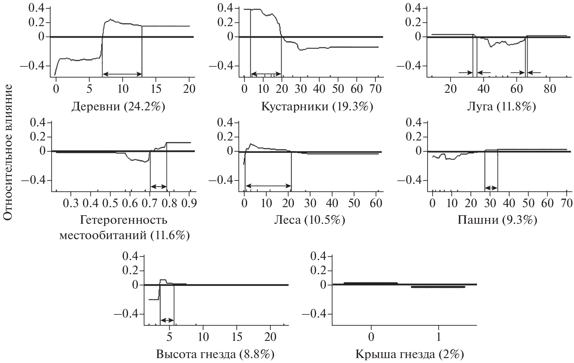 In 2001 to 2020, for each Long-eared owl nest in the Crane Homeland Nature Reserve territory with an area of 48 km2, the following microhabitat parameters were determined using standard field methods: the nest type built by different bird species, the presence of a nest roof, the nesting tree species, and the nest height above the ground. In most cases, for nesting the Long-eared owl reused magpie nests (Pica pica) (77%), and half of the nests were found on willow trees (family Salicaceae) (50%). The nest height above the ground varied from 1.5 to 22 m. Vegetation on the nesting area with a radius of 500 m was determined using the “Semi-Automatic Classification Plugin” automatic vegetation classifier of QGIS software. Five habitat types were so classified: forests, shrubs, meadows, arable land, and satellite image mistakes. Village areas were allocated separately. The average shares of the largest habitat types for over 20 years on the nesting sites included meadows (51.1%) and shrubs (16%). From 2001 to 2020, a habitat change in the breeding area was observed: forest and shrub areas decreased, while the meadow, village and arable land areas increased. An analysis of the effect of habitat types on the nesting success was evaluated by means of the “gbm” and “dismo” modules in the R program using the Boosted Tree classifier algorithm. The presence of such habitat types in the nesting area as villages (24.2%), shrubs (19.3%), meadows (11.8%), and habitat heterogeneity (11.6%) most strongly affected the probability of owl successful nesting. That owls tend to use anthropogenic and agricultural territories is associated with the diversity, easy foraging and more effective protection from predators during the breeding season.