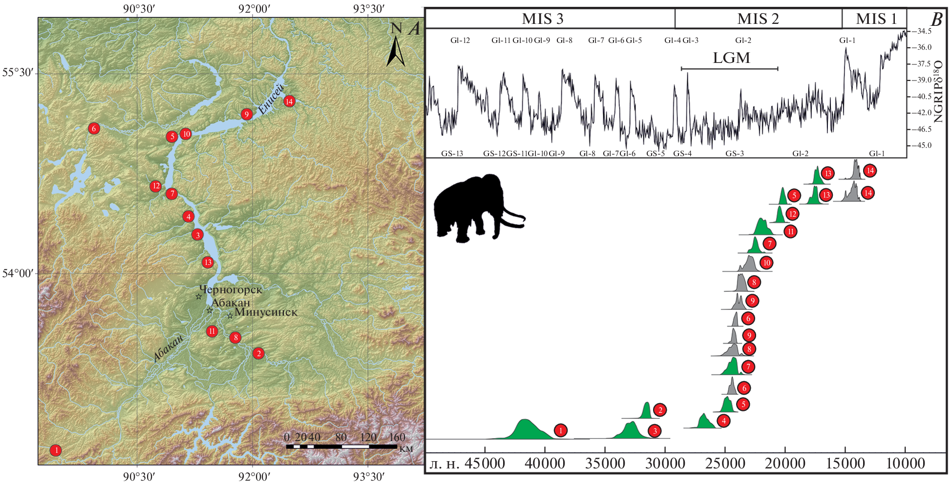 Radiocarbon dating of woolly mammoth remains from the Minusinsk Depression allows for the patterns of its distribution in southern Siberia in the Late Pleistocene to be specified. In the south of Siberia, mammoths are shown to have been most abundant in cold periods, the species having reached its maximum abundance in LGM. So far, there is no single mammoth record that would confidently refer to the warm time interval. During the warm intervals of the Late Pleistocene, the environment in southern Siberia could possibly have not favorable for the permanent habitation of the species Mammuthus primigenius. In general, the mammoths from the Minusinsk Depression retain species-specific features of the content of carbon and nitrogen stable isotopes (δ13C and δ15N) in bone collagen compared to other large herbivores. They show the highest δ15N values with the lowest δ13C, vs reindeer that, on the contrary, demonstrate the lowest δ15N values and a high δ13C. The isotopic signal of other herbivorous mammal species lies between the values of mammoths and reindeer. A comparison of the obtained data on carbon and nitrogen stable isotopes (δ13C and δ15N) of the woolly mammoth remains from the Minusinsk Depression with similar parameters in animals from the north of eastern Siberia reveals significant differences. One of the possible reasons may lie in differences in the diet of animals of the Minusinsk Depression from mammoths of other populations. However, similar trends, i.e. a relatively lower δ15N and higher δ13C content in the Late Pleistocene, are characteristic of both reindeer and woolly rhinoceroses of the Minusinsk Depression. This suggests that the differences in the carbon and nitrogen isotope composition in the Minusinsk Depression mammoths from those from the northern territories are due not only to the type of food, but also to a slightly different isotopic background of the region, associated with the local environment.