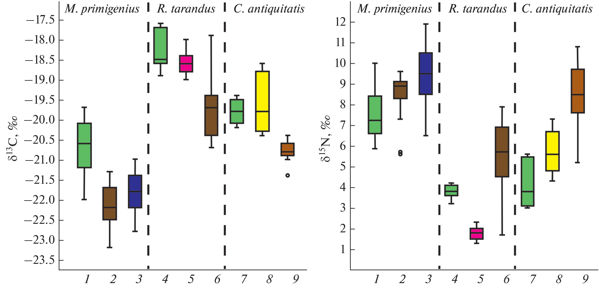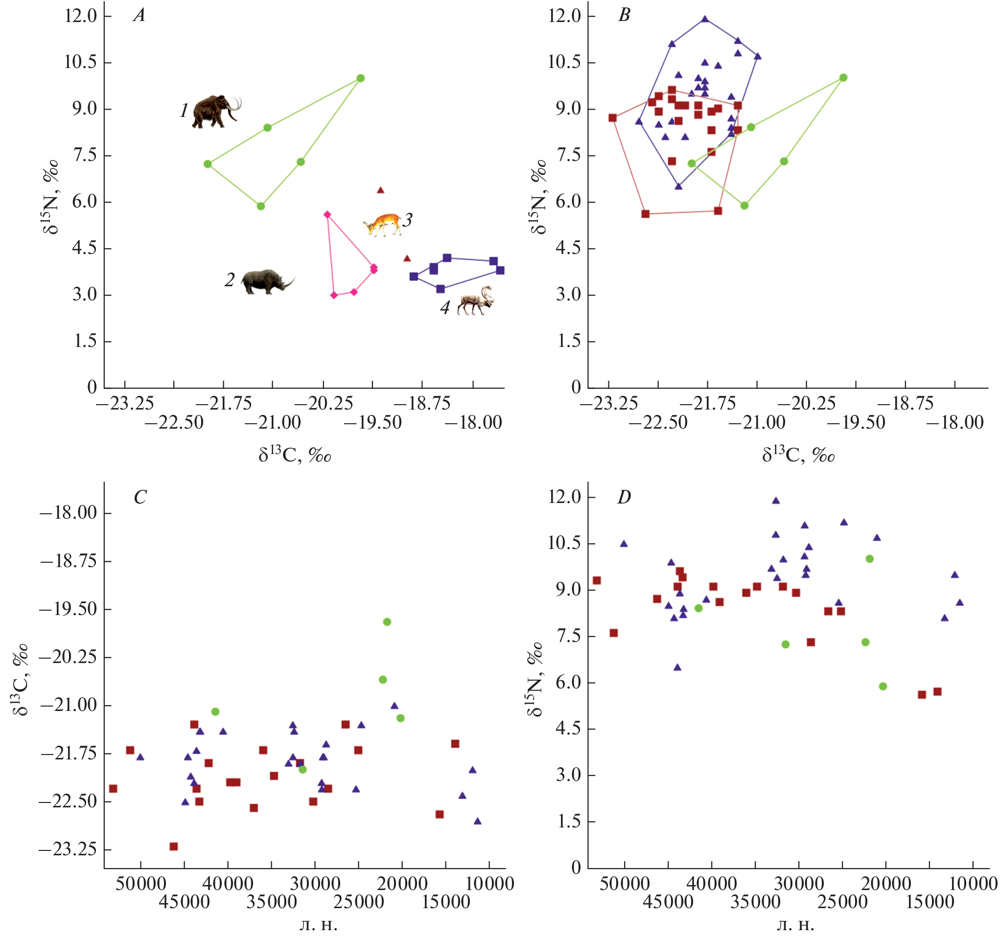 - Iacumin P., Nikolaev V., Ramigni M., 2000. C and N stable isotope measurements on Eurasian fossil mammals, 40 000 to 10 000 years BP: Herbivore physiologies and palaeoenvironmental reconstruction // Palaeogeography, Palaeoclimatology, Palaeoecology. V. 163. P. 33–47.