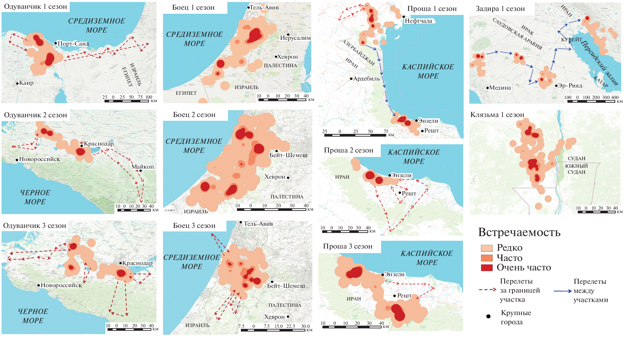 Using GPS-GSM trackers, data on the spatial distribution and habitat features during the wintering period were obtained for five young greater spotted eagles (Clanga clanga) tagged in the center of European Russia or the Middle Volga region. The wintering areas of the studied birds, with the exception of one individual in the second and third winters, were located in the Middle East (Israel, northern Egypt, Saudi Arabia, Iran), in South Africa (Sudan and South Sudan), and in Azerbaijan. An uneven distribution of greater spotted eagles in winter territories was revealed, within which the birds spent most of their time in preferred areas where they stayed for long periods. The size and configuration of winter territories depended on the availability of forage lands. Ecological features of the territories caused a difference in the square of wintering grounds and the character of daytime movements of different individuals. The bird wintering in the arid landscapes of the Arabian Peninsula with extremely poor forage conditions was forced to make maximal daily movements in search of prey. At the same time, individuals wintering in the deltaic Caspian plains in Iran and in the Prikubanskaya Plain in southern Russia found areas with a rich and affordable food which caused minimal daily movements and a minimum radius of the daytime territory. Based on telemetry and visual observations, a previously unknown area of sustainable wintering of greater spotted eagles in the south of European Russia has been localized. The paddy rice fields in the Prikubanskaya Plain as the most important forage habitat and the probable significance of the numerous and available brown rat (Rattus norvegicus) as the main prey species in winter are discussed. The data obtained form an important basis for the development of a strategy for the protection of this rare vulnerable species across the entire distribution range.