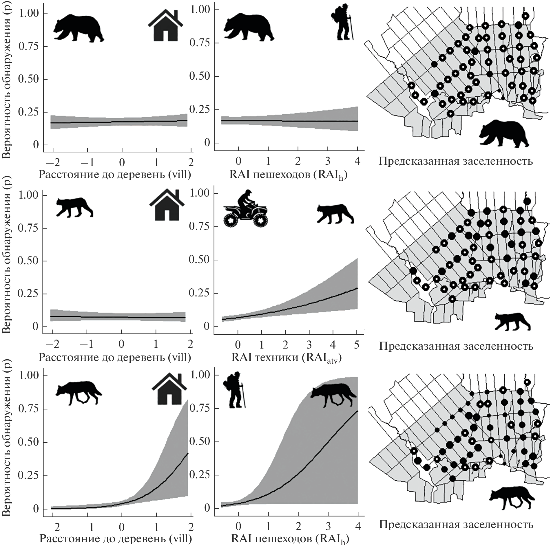 The possibilities for assessing the impact of human activity on mammals using camera traps are demonstrated in Russia for the first time, three species of large carnivores taken as examples: the brown bear (Ursus arctos), the Eurasian lynx (Lynx lynx), and the grey wolf (Canis lupus). To do this, a single-season species-level occupancy analysis and an analysis of daily activity were utilized. The study was carried out in 2022 in the territory of the Southern Forestry of the Central Forest Nature Reserve, western European Russia during the period of maximum human activity (July–August). The relative abundance indices of pedestrians, all-terrain vehicles, as well as the distance to villages were used as variables. The maximum predicted occupancy was found for the lynx (ψ = 0.97), vs the minimum for the wolf (ψ = 0.78). The detection probability was the highest for the brown bear (p = 0.18), in contrast to both lynx and wolf (0.08 each). For the lynx and the brown bear, large degrees of overlap of daily activities with pedestrians (\({{\hat {\Delta }}_{4}}\) = 0.57 and \({{\hat {\Delta }}_{4}}\) = 0.47) and all-terrain vehicles (\({{\hat {\Delta }}_{4}}\) = 0.51 and \({{\hat {\Delta }}_{4}}\) = 0.41) were noted, in contrast to those for the wolf (\({{\hat {\Delta }}_{1}}\) = 0.37 and \({{\hat {\Delta }}_{1}}\) = 0.35, respectively). Human activity had no noticeable effect on either the spatial or temporal distribution patterns of the brown bear and lynx. In contrast, the wolf showed a shift in both patterns away from human activity. The combined use of occupancy and daily activity analyses based on data from camera traps is the optimal method for assessing and regulating the human activity in particularly strictly protected natural areas.