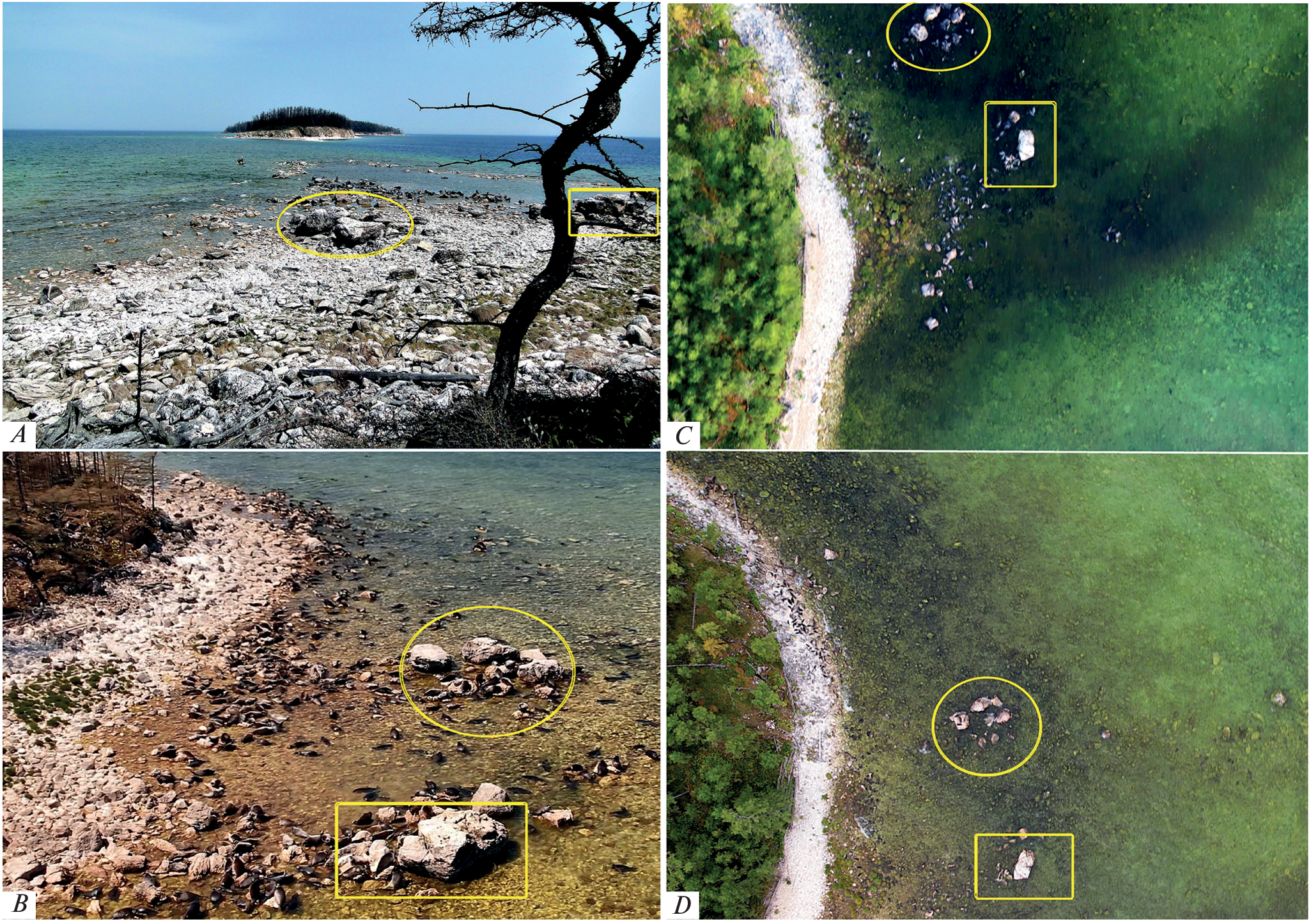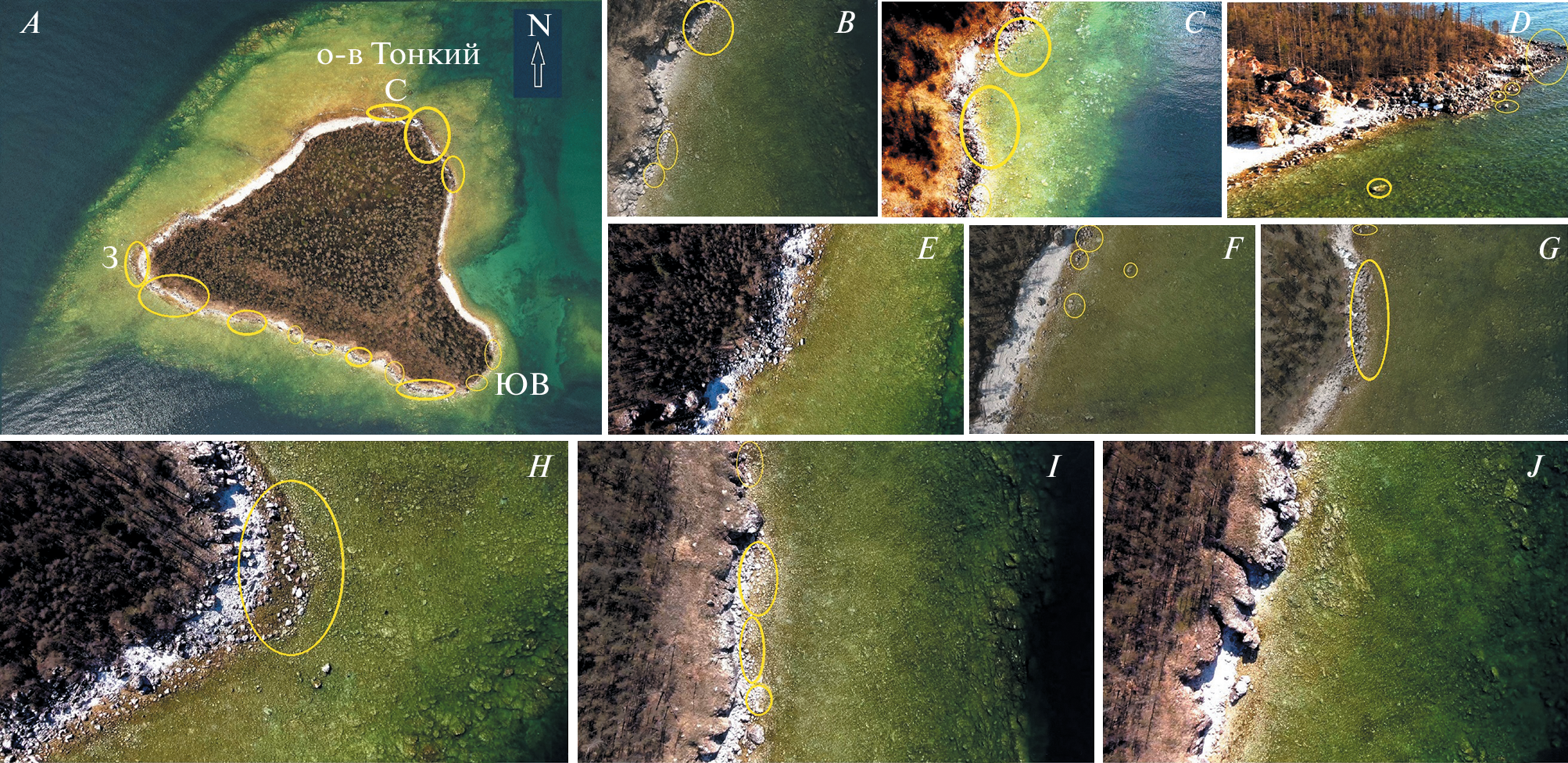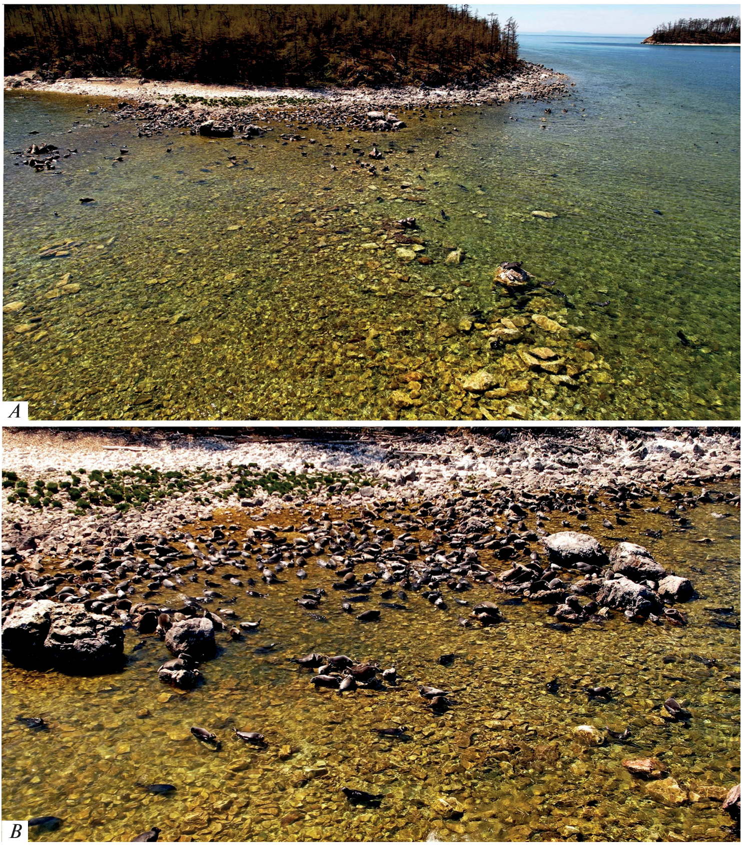 For the first time, a detailed description of the coastline of the Ushkan’y Islands, Lake Baikal is given in order to assess the use of the shore by the Baikal seal (Pusa sibirica Gm.) as haulouts, and the role these haulouts play in the annual cycle of seals. To do this, video material obtained using the DJI UAV Mavic 2 Zoom (take-off weight 905 g) and Air 2 S (take-off weight 595 g), as well as long-term field observations were used. A complete survey of the coastline of all four islands was carried out on May 29th and 30th, 2022 (at a water level of 456.40 m a.s.l.) and on August 12th and 24th (water level 456.79 and 456.83 m, respectively). Based on lithological characteristics, about 30% coastline on the Bolshoy Island, the largest one, is shown to be suitable for use by seals, but currently this is not the case. Among the three smaller islands, the most favorite place for the formation of seal haulouts is the Kruglyi Island, based on the total number of animals recorded on the island and in coastal waters, followed by the Tonkiy Island and then the Dolgiy Island, the latter supporting a stationary video system transmitting information online. On all islands, coordinates of specific haulout/rookery locations have been determined. Currently, about 35% length of the coastline of the three smaller Ushkan’y Islands are being used by seals for haulouts to one degree or another. Under current climatic conditions, the rookeries on the smaller Ushkan’y Islands seem to play extremely important roles for a significant part of the population (several thousand individuals visit them every season), since most other rookeries and locations that seals could use as such are highly susceptible to anthropogenic impacts.