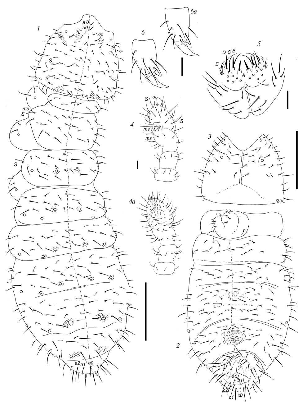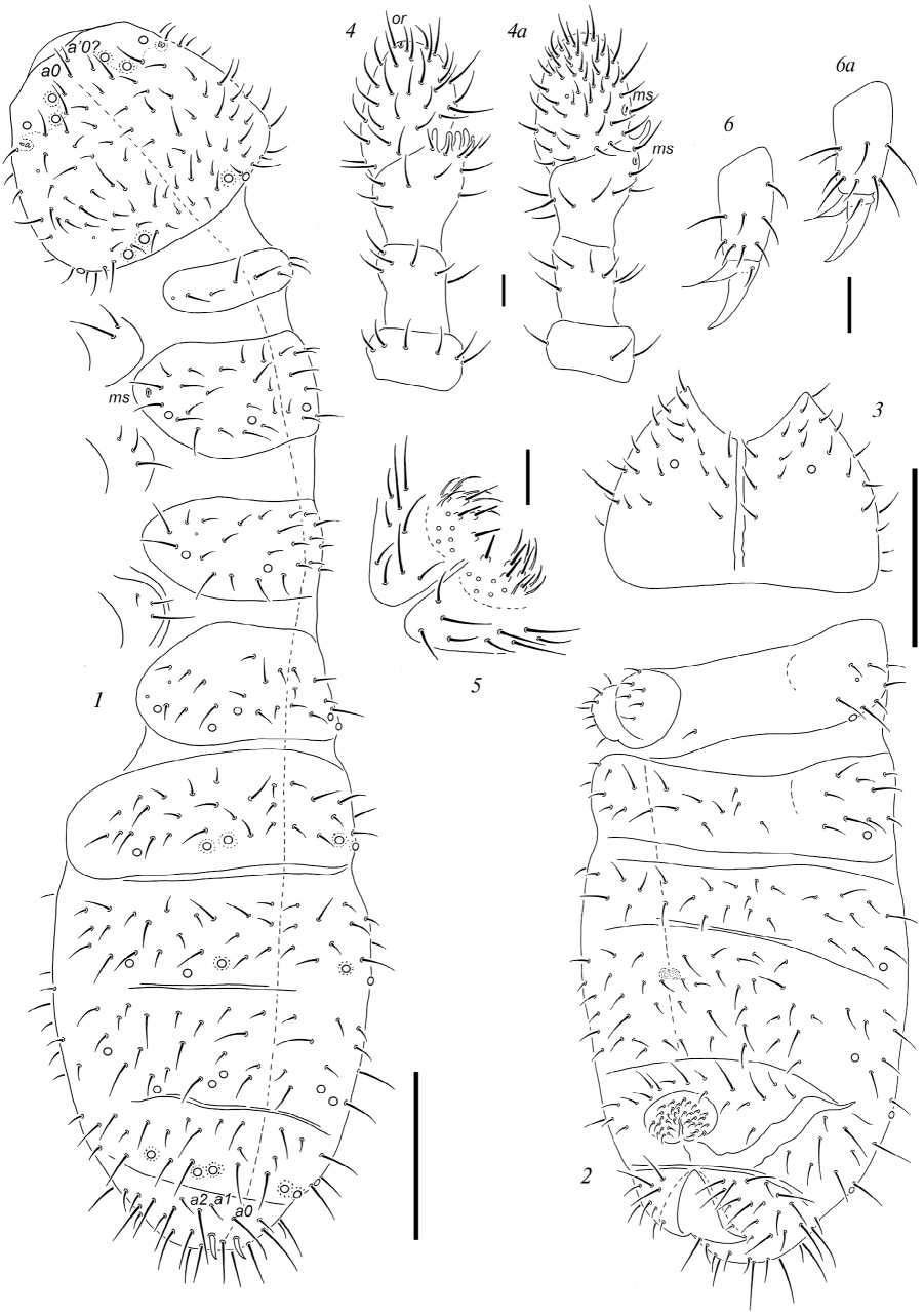 Dorsal setae poorly differentiated into macro- and microsetae, symmetrical in general (Fig. 5, 1). S-setae indistinct. Head with a single axial unpaired seta a0; d0 absent as usual for the genus. Setae p1 on head in front of setae p2. Th. I with 4(5)+4(5) dorsal setae. Lateral ms present on both Th. II and Th. III. Terga of Th. II–Abd. III each with 3–4 pairs of axial setae. On Abd. VI seta a0 similar in length to setae a2, setae a1 three times shorter than a0. Thoracic sterna without setae. Ventral chaetotaxy of abdomen as in Fig. 5, 2.